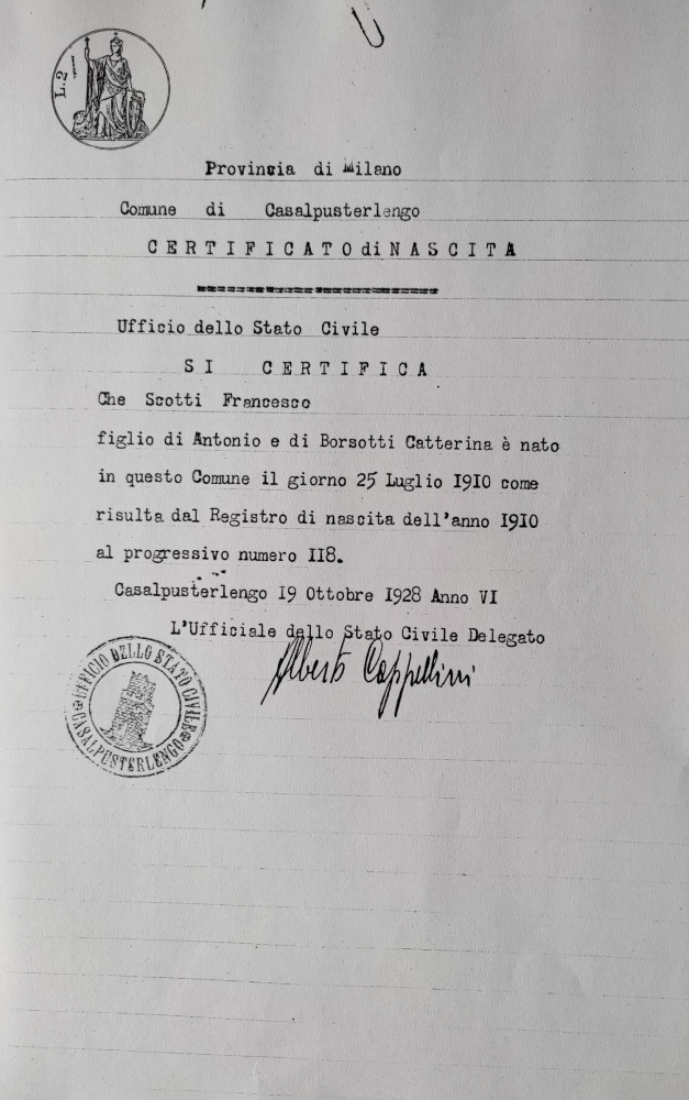 Francesco Scotti nasce a Casalpusterlengo da Antonio, sarto e Caterina Borlotti. Francesco, detto Cecchino, è l'ultimo di cinque figli: la primogenita Giulia (morta nel 1921 per le conseguenze della Spagnola), Enrico, Giuseppe e Luigi.