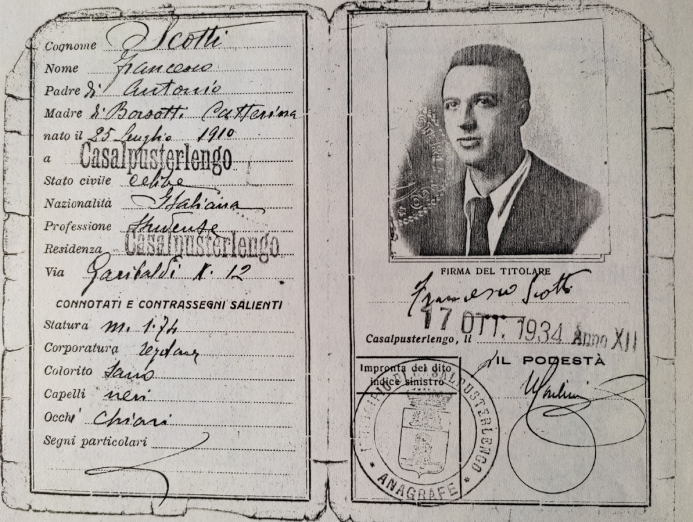 Francesco Scotti nasce a Casalpusterlengo il 25 luglio 1910. Il padre è un sarto, la madre una casalinga. Francesco ha tre fratelli e una sorella. Dopo le scuole elementari, frequenta il ginnasio a Codogno. Sono anni di occupazioni delle fabbriche e di agitazioni contadine, nonché delle prime “imprese” delle squadre fasciste e Scotti si schiera con operai e contadini. Dopo il liceo a Lodi, si iscrive a Medicina a Milano. Nel ‘31 con Aldo e Giovanni Mirotti, suoi amici d’infanzia costituisce nella cittadina natia una sezione del Partito comunista italiano. Il loro attivismo è però presto soffocato: il 25 ottobre ‘31 sono arrestati. Condannato a 4 anni di detenzione, dietro le sbarre continua a studiare medicina e approfondisce la propria formazione politica e umana. Rilasciato sul finire del ‘34, rientra a casa e riprende gli studi e la sotterranea attività politica. Sfuggito a una retata nel marzo ‘36, decide di espatriare e dopo varie peripezie giunge a Parigi.