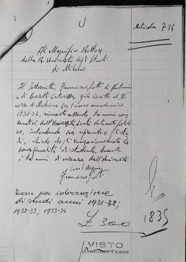 Dopo il ginnasio a Codogno e il liceo a Lodi, Francesco si iscrive a medicina nella nuova Università di Milano. In famiglia, solo lui e suo fratello Luigi, tipografo che stampa e distribuisce fogli clandestini, continuano a manifestare apertamente il loro dissenso politico. Conosce il sindacalista Giovan Battista Maglione, che gli permette di leggere le pubblicazioni clandestine comuniste e socialiste.
