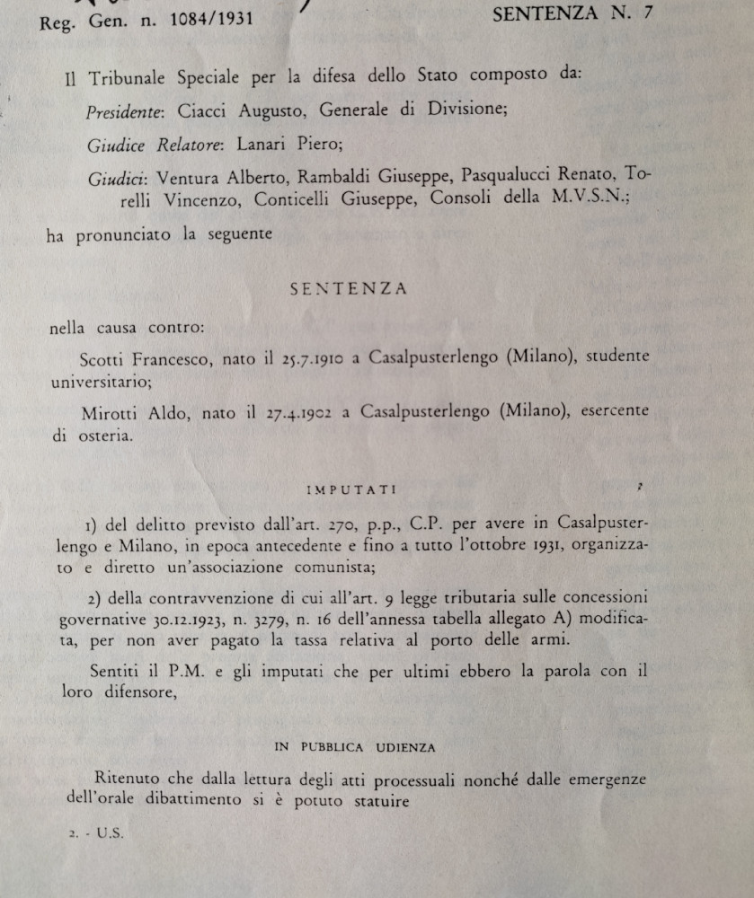 Francesco Scotti viene arrestato come agitatore comunista. Viene rinchiuso prima a San Vittore, poi a Regina Coeli, fino al giorno della sentenza, il 25 ottobre 1933, quando viene condannato a quattro anni di reclusione, da scontarsi nel carcere di Civitavecchia.