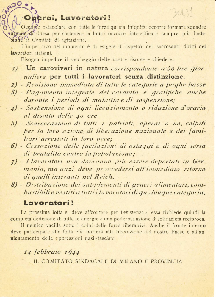 Agli inizi del 1944, sotto la spinta del PCI, si costituisce il Comitato segreto di Agitazione per il Piemonte, Liguria e Lombardia che diffonde l’appello per uno sciopero generale nell’Italia settentrionale sostenuto dal CLN, Comitato di Liberazione Nazionale. Gli obiettivi sono di natura economica ma si chiede anche di cessare le deportazioni di forza lavoro e la produzione bellica a favore della Germania. La natura insurrezionale dello sciopero è esplicitamente evocata, ma poi questo obiettivo passa in secondo piano di fronte al rallentamento delle operazioni militari degli Alleati. L’aspetto rivendicativo tende a prevalere ma è evidente a tutti che l’iniziativa conserva i caratteri di una prova di forza dal forte valore politico.