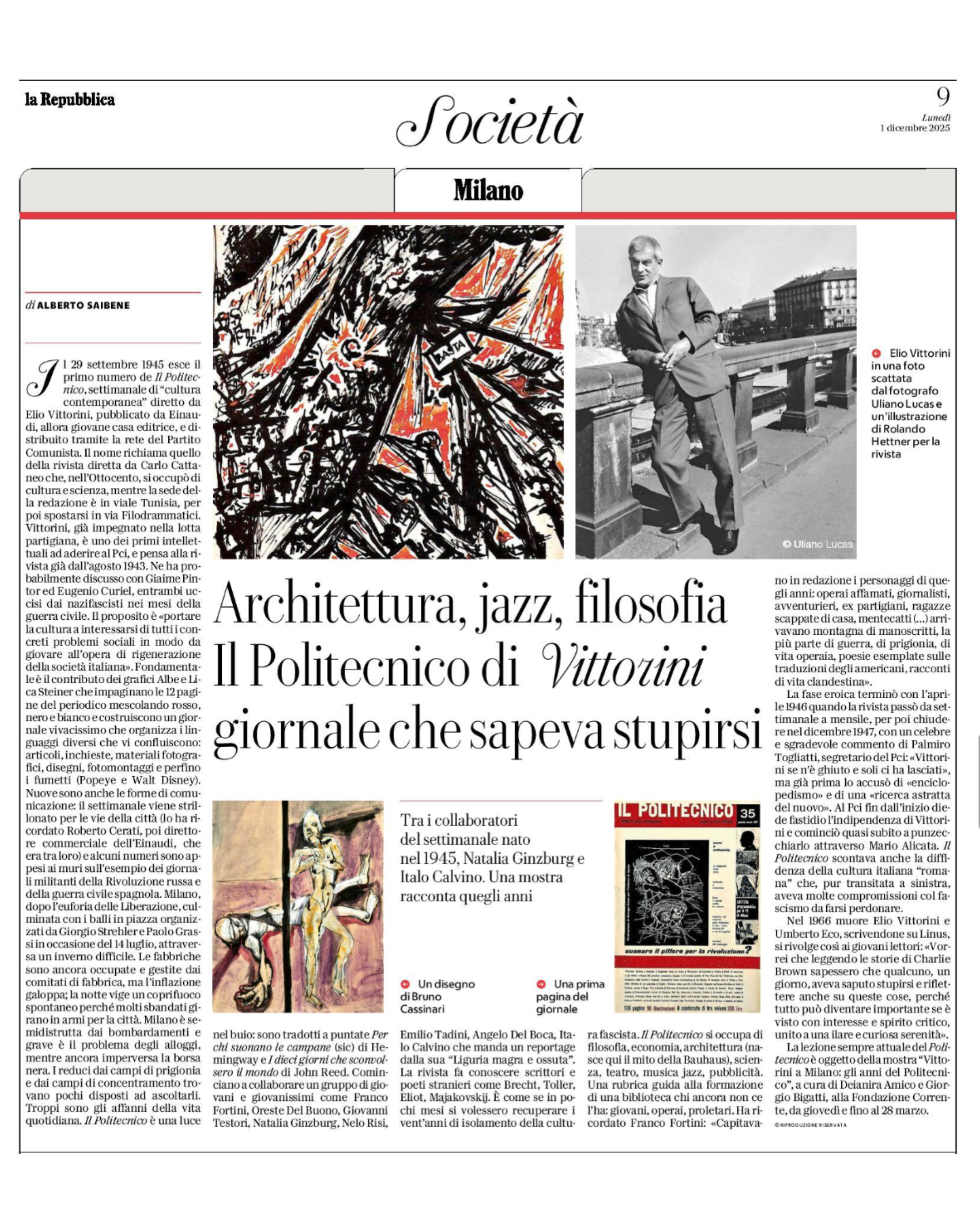 - Architettura, jazz, filosofia. Il Politecnico di Vittorini, giornale che sapeva stupirsi, di Alberto Saibene, su la Repubblica, 1 dicembre 2025, pag. 9.