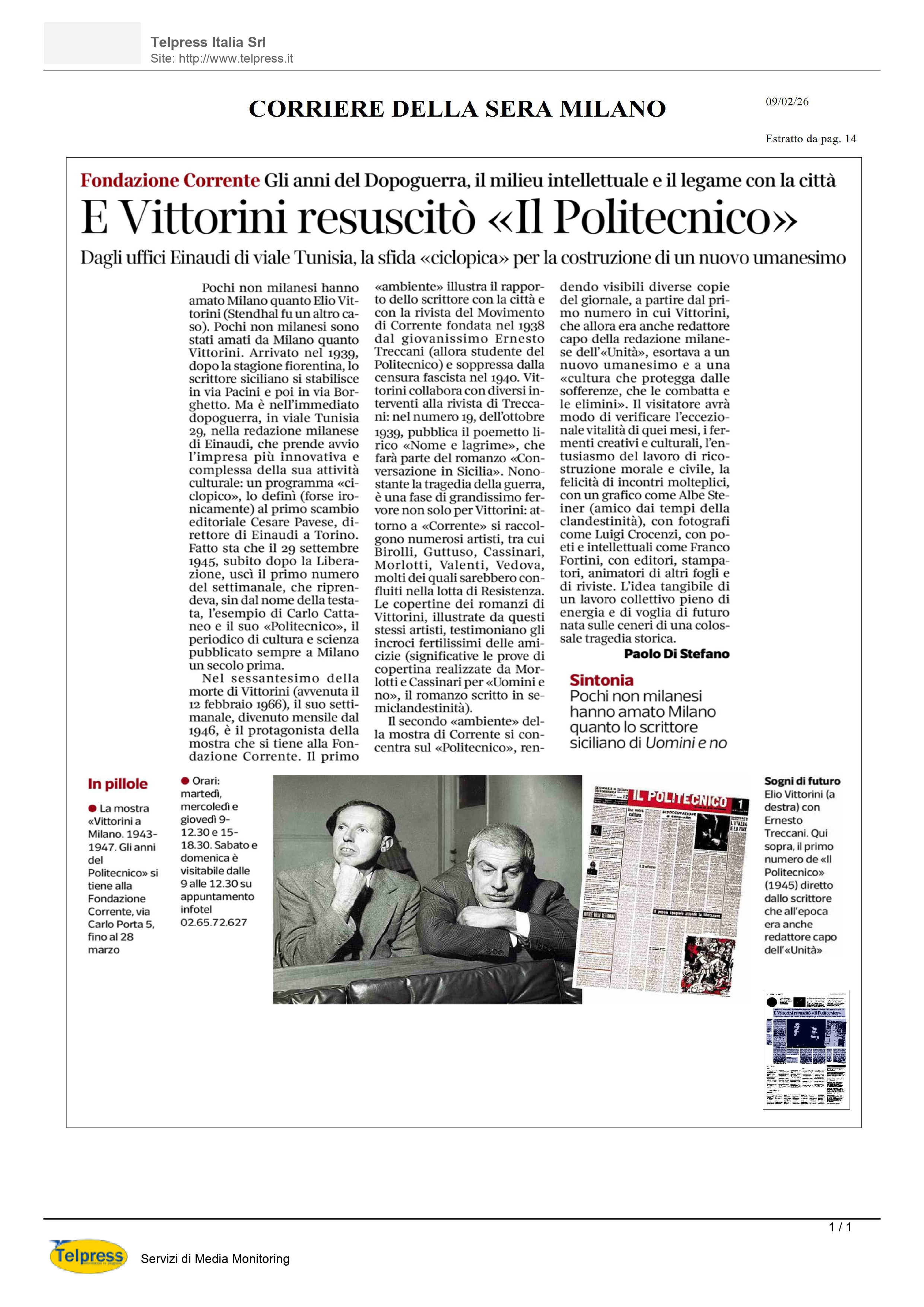 Nell’ottantesimo anniversario dalla pubblicazione della rivista “Il Politecnico”, da giovedì 4 dicembre 2025 a sabato 28 marzo 2026 la Fondazione Corrente apre al pubblico l’esposizione “Vittorini a Milano. 1943-1947. Gli anni del Politecnico”, organizzata con Fondazione ISEC di Sesto San Giovanni e Fondazione Gramsci di Roma, in collaborazione con Studio Origoni Steiner di Milano e il Centro di Raccolta e Archiviazione della Fotografia (CRAF) di Spilimbergo, con il patrocinio del Comune di Milano e del centro Archivi della Parola, dell’Immagine e della Comunicazione Editoriale (Apice) e il contributo di Regione Lombardia e Fondazione Cariplo.