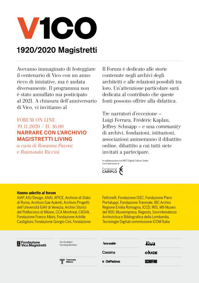 Fondazione ISEC ha aderito al forum online organizzato dalla Fondazione Vico Magistretti in collaborazione con MEET e con il patrocinio di Fondazione Cariplo, in occasione del centenario di Vico Magistretti: il forum, a cura di Rosana Pavoni e Raimonda Riccini, sarà dedicato alle storie contenute negli archivi degli architetti e alle relazioni possibili tra loro, con una riflessione speciale sul contributo che queste fonti possono offrire alla didattica.
