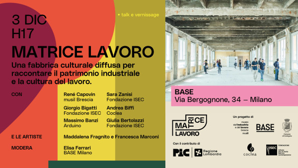 Il 3 dicembre dalle H17, nella Ground Hall di BASE si svolgerà il talk di introduzione alla mostra di Matrice Lavoro, un progetto pensato per leggere la cultura del lavoro come “matrice” (origine storica ma anche risorsa attuale) dell’identità territoriale regionale per ripensare il futuro della …
