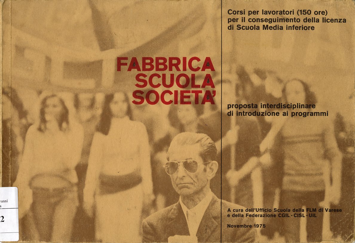 Quella che segue è, invece, la copertina interna di un libro del novembre 1975 che raccoglie i programmi dei corsi per lavoratori per il conseguimento della licenza di scuola media inferiore organizzati dalla Federazione Lavoratori Metalmeccanici di Varese. La pagina riporta schematicamente gli obiettivi generali di questi corsi. All’interno del libro si trovano materiali e letture relative alla storia della scuola e dell’alfabetizzazione, dati sui meccanismi di selezione vigenti e riflessioni sul rapporto scuola-società; e poi, ancora, interventi sui temi del lavoro, della condizione della donna lavoratrice, delle migrazioni interne e internazionali, dove il racconto della propria esperienza è sempre il punto di partenza per percorsi di approfondimento più generali.