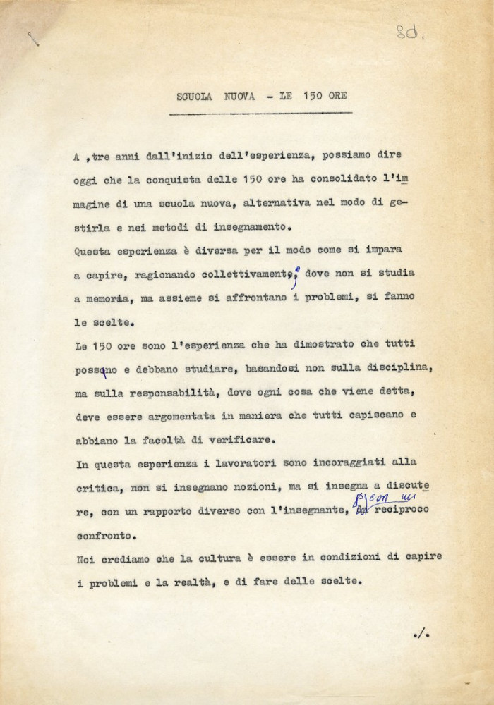 Da questo approccio discendono alcuni motivi ricorrenti dell’esperienza formativa delle 150 ore: la critica alla separatezza e ai meccanismi selettivi della scuola tradizionale, la proposta di nuovi contenuti legati alla concretezza della propria condizione sociale, la sperimentazione di modi dell’apprendimento/insegnamento fondati sui principi della cooperazione educativa, della ricerca sociale, della discussione e della continua problematizzazione dei dati, in un rapporto fertile con le teorie pedagogiche più innovative che si andavano diffondendo nella scuola italiana di ogni ordine e grado (si pensi alla critica alla presunta autorità del manuale come fonte esclusiva di apprendimento delle conoscenze che rimanda al metodo freinetiano dell’autoproduzione dei testi scolastici).
