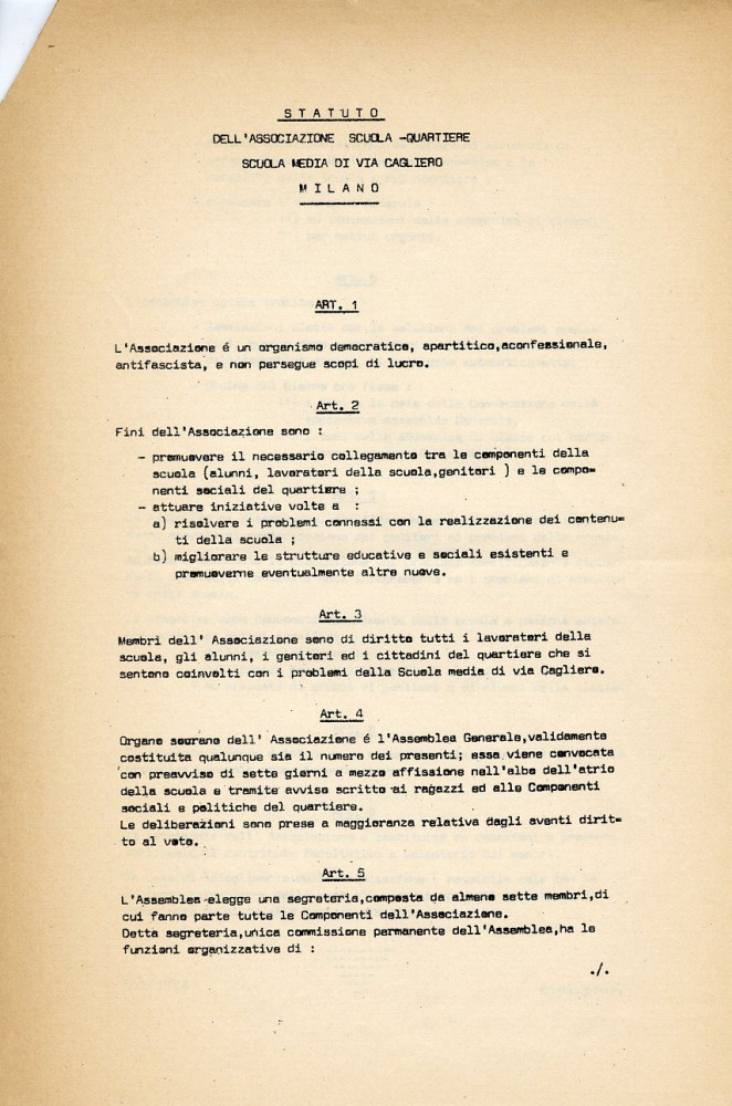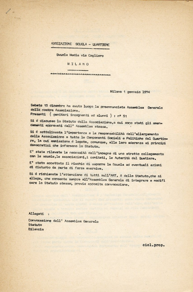 È del 1974, invece, il verbale di un’assemblea dell’Associazione scuola-quartiere composta da genitori, insegnanti e alunni e aperta al rapporto con i soggetti sociali e politici del territorio.