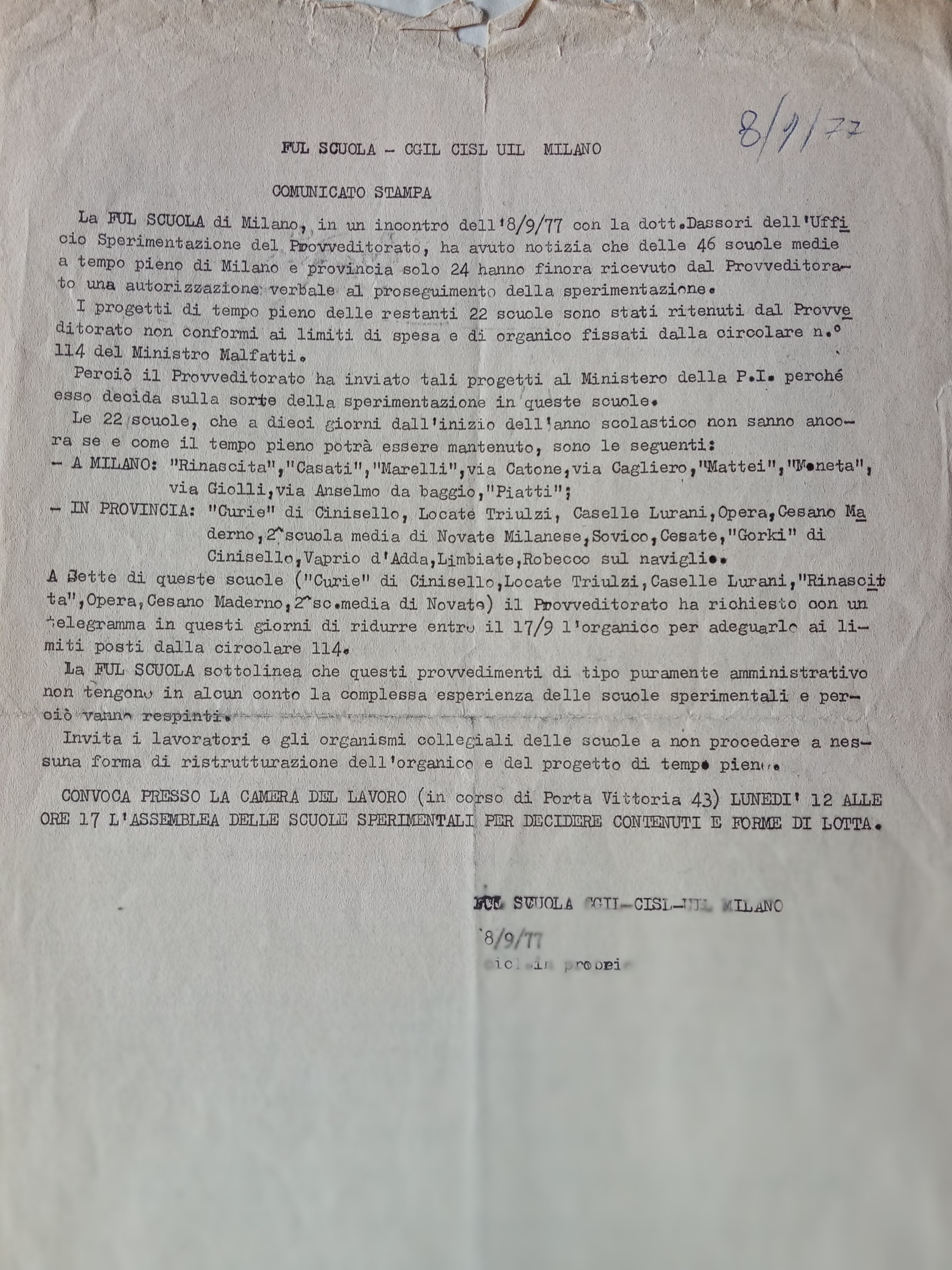 Un documento sindacale conservato nel Fondo scuola media statale “R. Franceschi" dell’archivio di Fondazione ISEC dà numeri e nomi a questo movimento: al 1977 sono riconosciute come sperimentali a tempo pieno a Milano e provincia 46 scuole medie tra cui Rinascita, via Cagliero (Franceschi), Piatti, via Catone, Casati, Marelli, la Curie di Cinisello, la 2° scuola media di Novate, Sovico. Alcune scuole con importanti sperimentazioni di tempo pieno sfuggono alla rilevazione: è il caso della Casa del Sole, la scuola all’aperto del parco Trotter, ancora vincolata al regime di “scuola speciale per bambini gracili”.