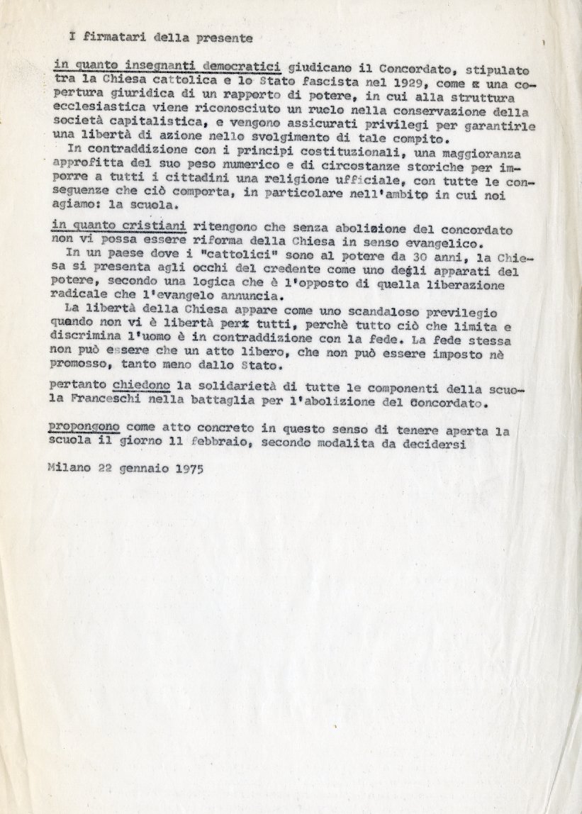 Il forte impegno politico – valoriale che sostiene il movimento delle scuole sperimentali è restituito dal documento sottostante che comunica la decisione dei docenti di tenere aperta la scuola l’11 febbraio, festa celebrativa dei Patti Lateranensi del 1929.
