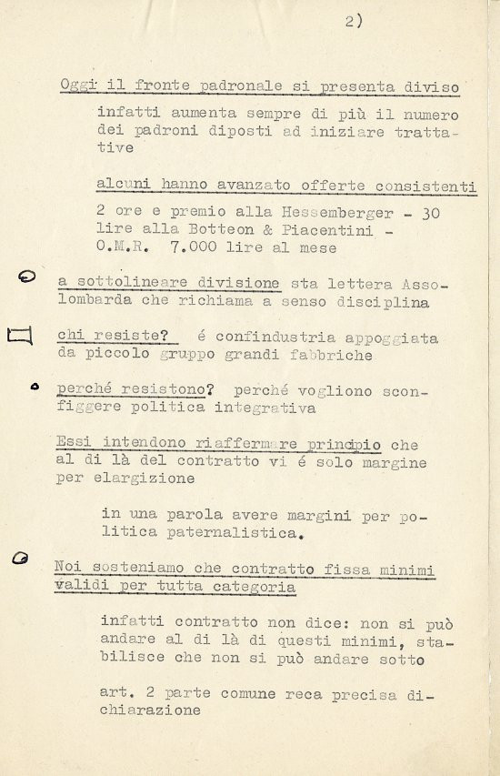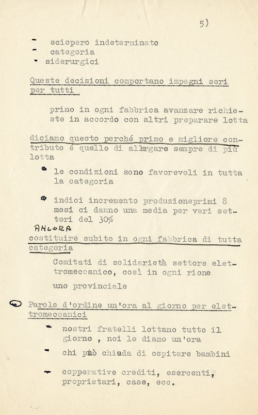 Gli operai chiedevano la definizione del contratto integrativo aziendale con aumento delle retribuzioni del 15%, riduzione delle ore di lavoro a 40 pagate 48 ore, parità di retribuzione tra uomini e donne, giovani e adulti, contrattazione di cottimo, qualifiche e organici: obiettivi riguardanti, quindi, non solo l’aspetto retributivo ma la condizione lavorativa nel suo complesso, che mettevano al centro la questione dei diritti in fabbrica e la partecipazione a quel benessere che la crescita dell’economia italiana allora in pieno sviluppo aveva generato. Questo tipo di richieste avrebbe poi accompagnato tutta la mobilitazione degli anni successivi culminata nell’autunno caldo.