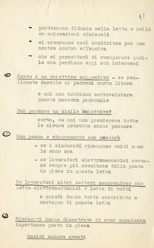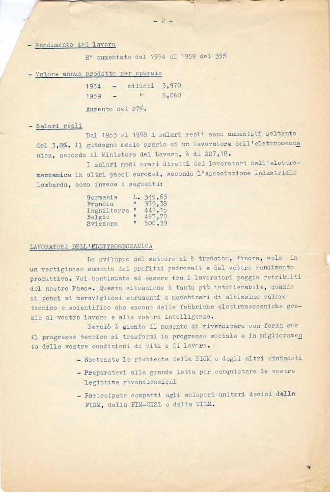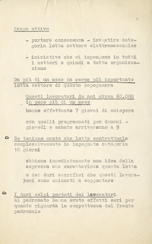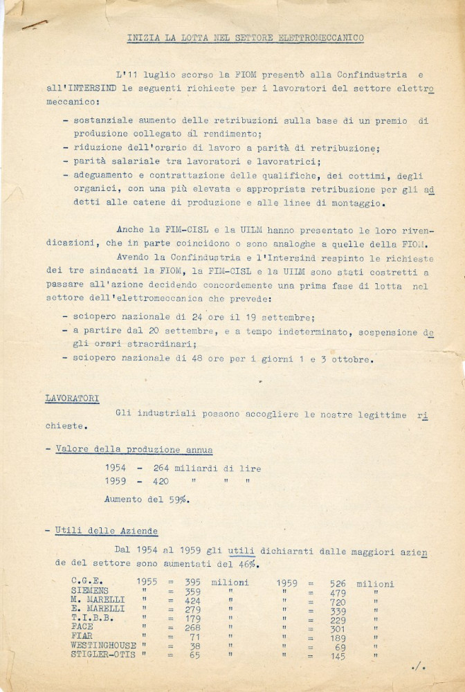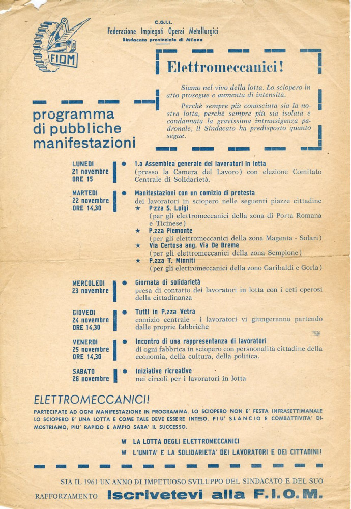 Per i contenuti e le forme della mobilitazione, nonché per il suo esito finale, la vertenza degli elettromeccanici milanesi va considerata un punto di svolta nella storia delle relazioni industriali. L’intera vicenda è ricostruita attraverso l’utilizzo della documentazione del Fondo Giuseppe Sacchi – appunti personali, relazioni, volantini, fotografie, ritagli di giornali - conservato presso l’archivio di Fondazione Isec. Giuseppe Sacchi, lo ricordiamo, era in quel momento segretario cittadino della Fiom. In gran parte a lui va ascritto il merito di aver intuito che le ragioni degli elettromeccanici avrebbero vinto se fossero arrivate al cuore dell’intera città anche attraverso inedite forme di mobilitazione.