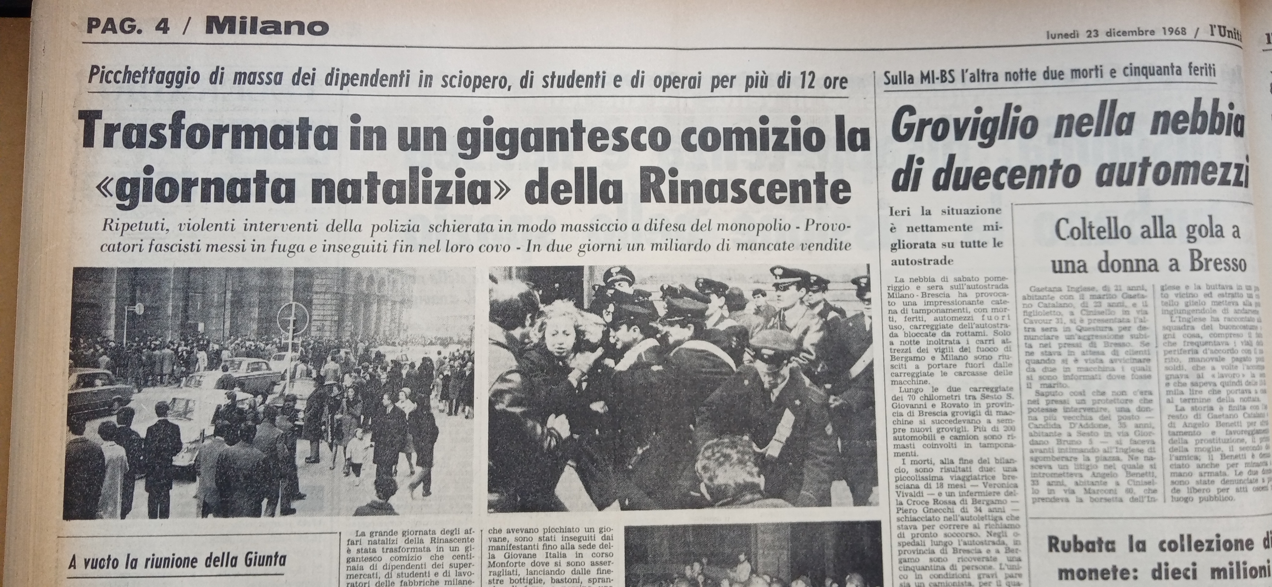 Quello del 1960 non è stato l’unico Natale di lotta a Milano. Il 22 dicembre del 1968 scioperarono i dipendenti della grande distribuzione e le commesse della Rinascente di piazza Duomo bloccarono l’accesso con dei picchetti molto partecipati. Alla mobilitazione si unirono gli studenti e gli operai di molte fabbriche milanesi e per 12 ore l’intera piazza Duomo fu teatro di volantinaggi, comizi, capannelli a sostegno della vertenza sindacale in corso, in cui si denunciavano le dure condizioni di lavoro degli operai ma anche i meccanismi disumanizzanti e consumistici del sistema capitalistico. L’intera manifestazione fu caratterizzata da duri scontri con la polizia e anche da aggressioni di gruppi neofascisti ma costituì un momento di lotta e partecipazione indubbiamente significativo, non solo dal punto di vista strettamente sindacale.