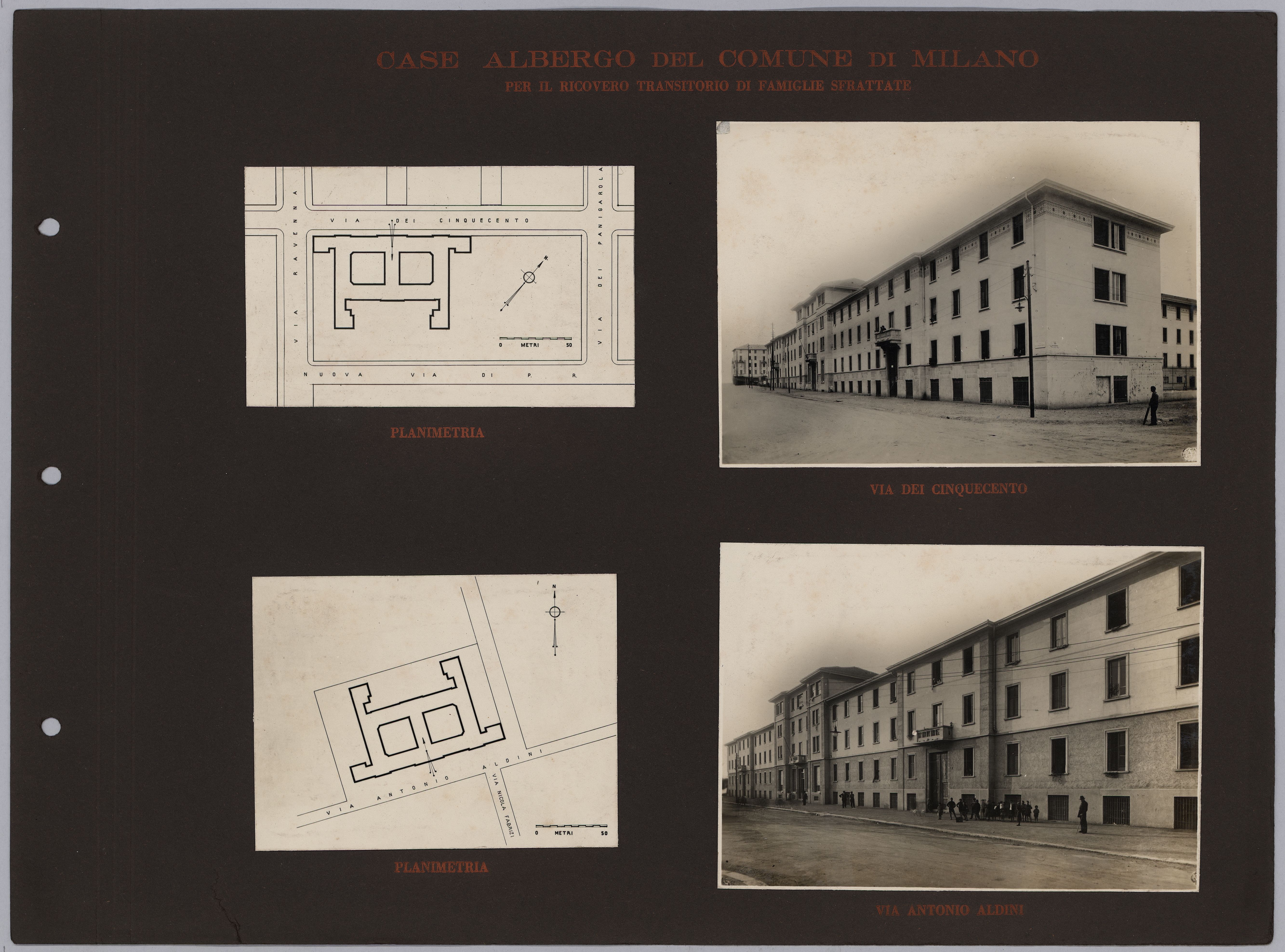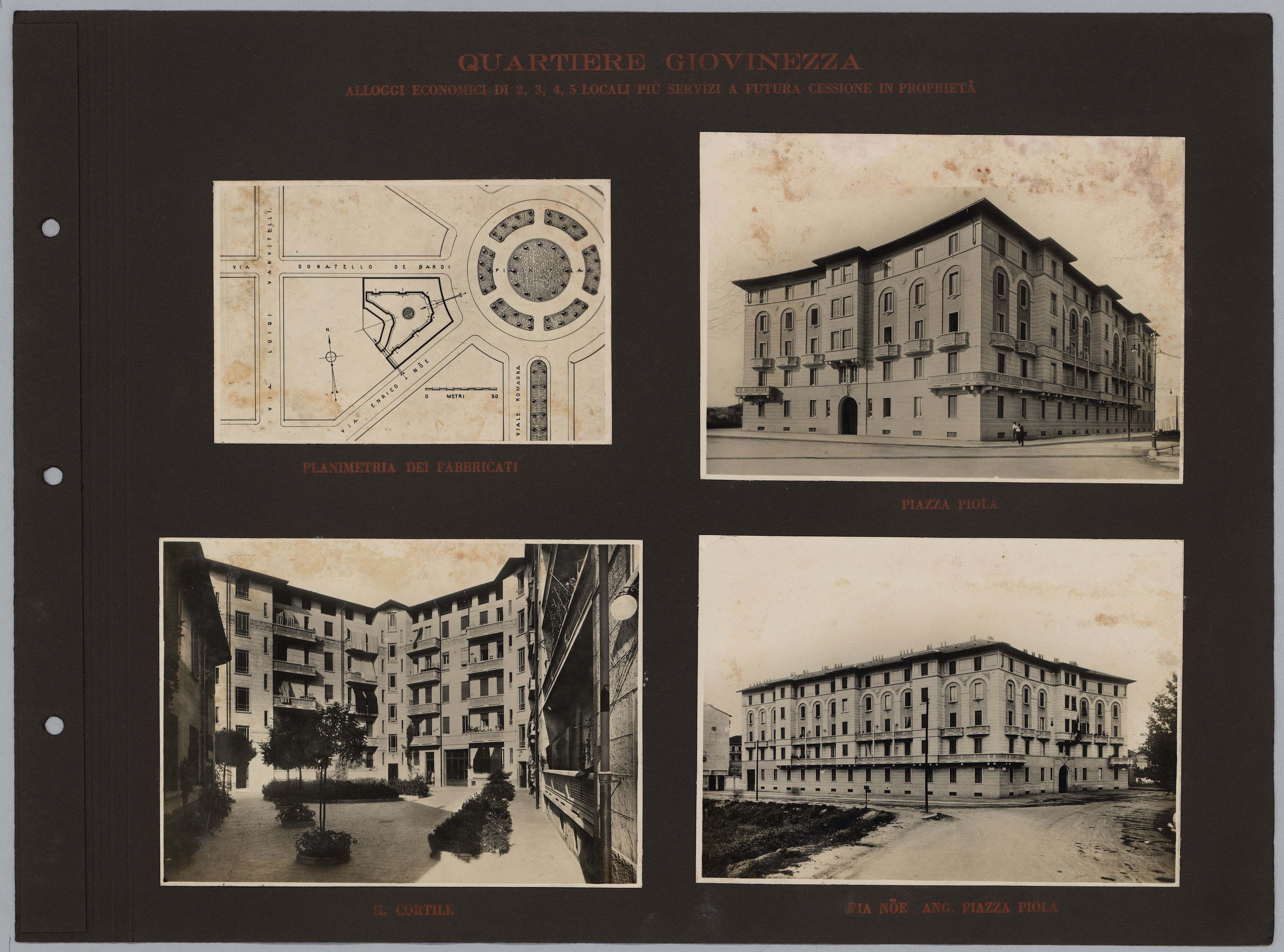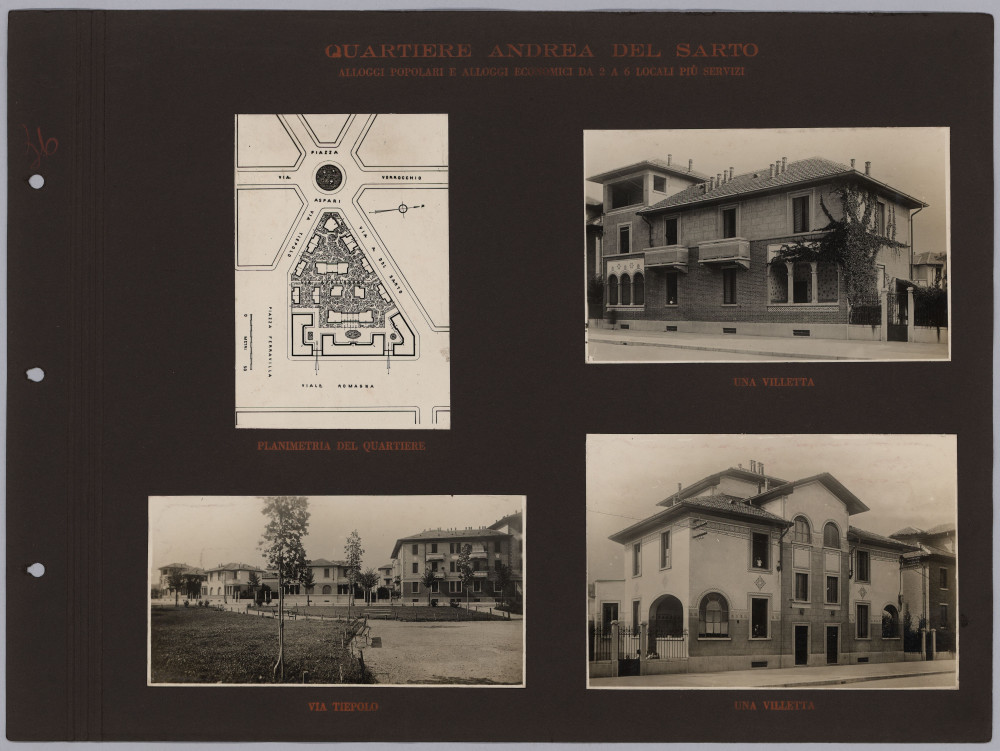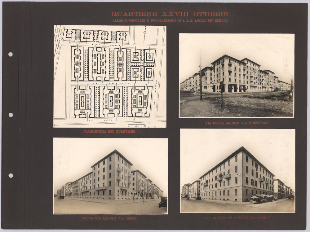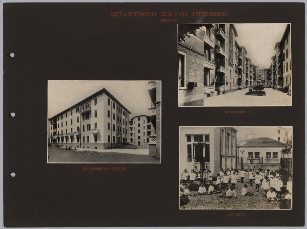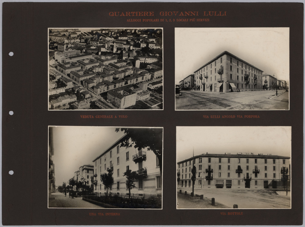 Pur non riportando altre informazioni oltre al titolo, l’album è con ogni probabilità opera dell’Istituto Autonomo Case Popolari. Esso appare come la prosecuzione e l’aggiornamento di un testo del 1929 – L’Istituto per le case popolari di Milano e la sua opera tecnica dal 1909 al 1929 – scritto e curato da Giovanni Broglio, in quegli anni a capo dell’ufficio tecnico dell’Istituto Autonomo per le Case Popolari di Milano. Anche questo testo, come l’album fotografico, contiene numerose immagini delle realizzazioni fatte da IACP, molte ritornano identiche nelle due pubblicazioni. Questo ci permette di risalire al fotografo che le ha realizzate, Antonio Paoletti: di origini livornesi, nella prima metà del ‘900 lavorò a Milano collaborando con numerose istituzioni pubbliche (Castello Sforzesco, Museo archeologico, Galleria d’Arte moderna), aziende (AEM e Edison Volta) e anche con l’Istituto fascista per le Case Popolari.