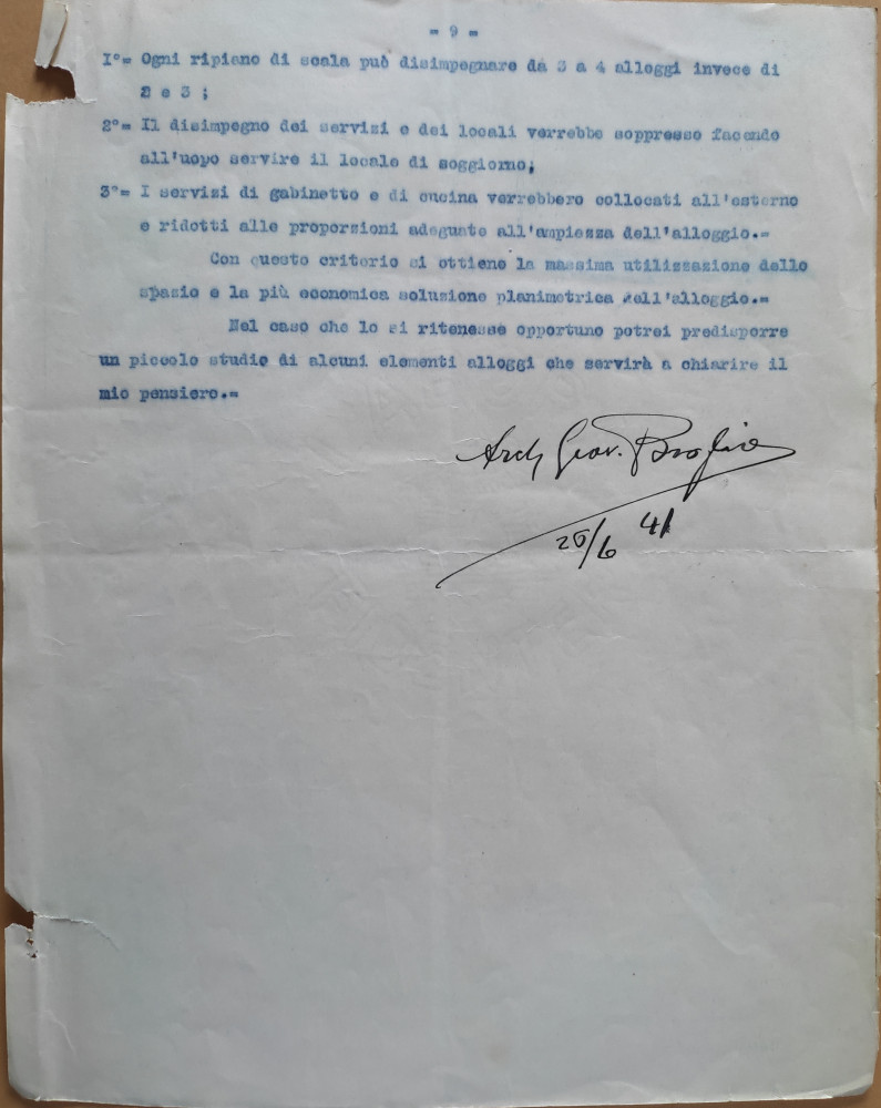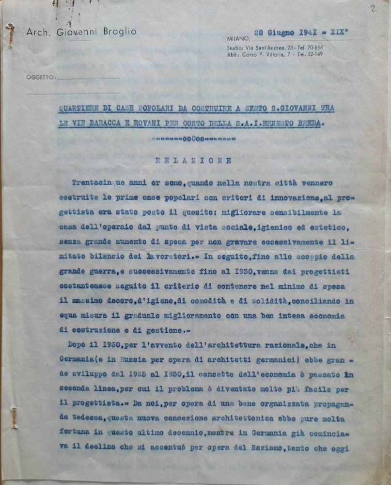 Una relazione scritta da Broglio il 28 giugno 1941 e inviata alla Breda, intitolata “Quartiere di case popolari da costruire a Sesto S. Giovanni tra le vie Baracca e Rovani per conto della S.A.I. Ernesto Breda”, ci permette di capire quale fosse la filosofia che animava questo architetto che, nato nel 1876 in Canton Ticino in un’umile famiglia italiana (il padre era occupato nello scavo della Galleria del San Gottardo), lavorando di giorno come operaio e frequentando dei corsi serali, era riuscito con notevoli sacrifici a laurearsi nel 1900 al Regio Istituto Tecnico Superiore, l’odierno Politecnico di Milano, per dedicare gran parte della sua vita professionale alla costruzione di case e quartieri per i lavoratori, soprattutto a Milano (dal 1912 Broglio aveva trovato impiego presso lo Iacp in qualità di dirigente dell’Ufficio progettazione), avendo come idea di fondo quella di migliorare le condizioni di vita delle fasce più disagiate della popolazione. Ebbene, in quella relazione Broglio, nel descrivere le caratteristiche del nuovo edificio da lui immaginato, non mancava di ribadire che lo scopo era quello “di fornire case sane e decorose alle famiglie dei piccoli impiegati, dei capi riparto e degli operai, che formano i quadri della vostra organizzazione, come premio di fedeltà e di attaccamento al lavoro. […] La disposizione dei fabbricati […] venne studiata in modo da ottenere il migliore orientamento e soleggiamento degli alloggi senza alcun sacrificio per l’estetica del complesso degli edifici. […]”. Gli appartamenti poi, “colla loro varietà di forma, ricchezza di balconi e terrazzi e distinzione di colori, devono formare un complesso semplice e armonico, che renda l’alloggio gradevole soggiorno per le famiglie […] Tornando dall’officina, gli operai devono sentire di entrare non in un alveare umano e tanto meno in un’altra officina, sia pure meno nera e meno rumorosa, ma in un ambiente confortevole, accogliente e comodo” (Archivio Fondazione ISEC, fondo Breda IV sez. – Dean). Idee indubbiamente coerenti con l’opera svolta da Broglio nei decenni precedenti, in parte certo retaggio dei suoi sacrifici giovanili e delle esperienze abitative che aveva vissuto in prima persona, quando ancora studiava e lavorava per mantenersi.