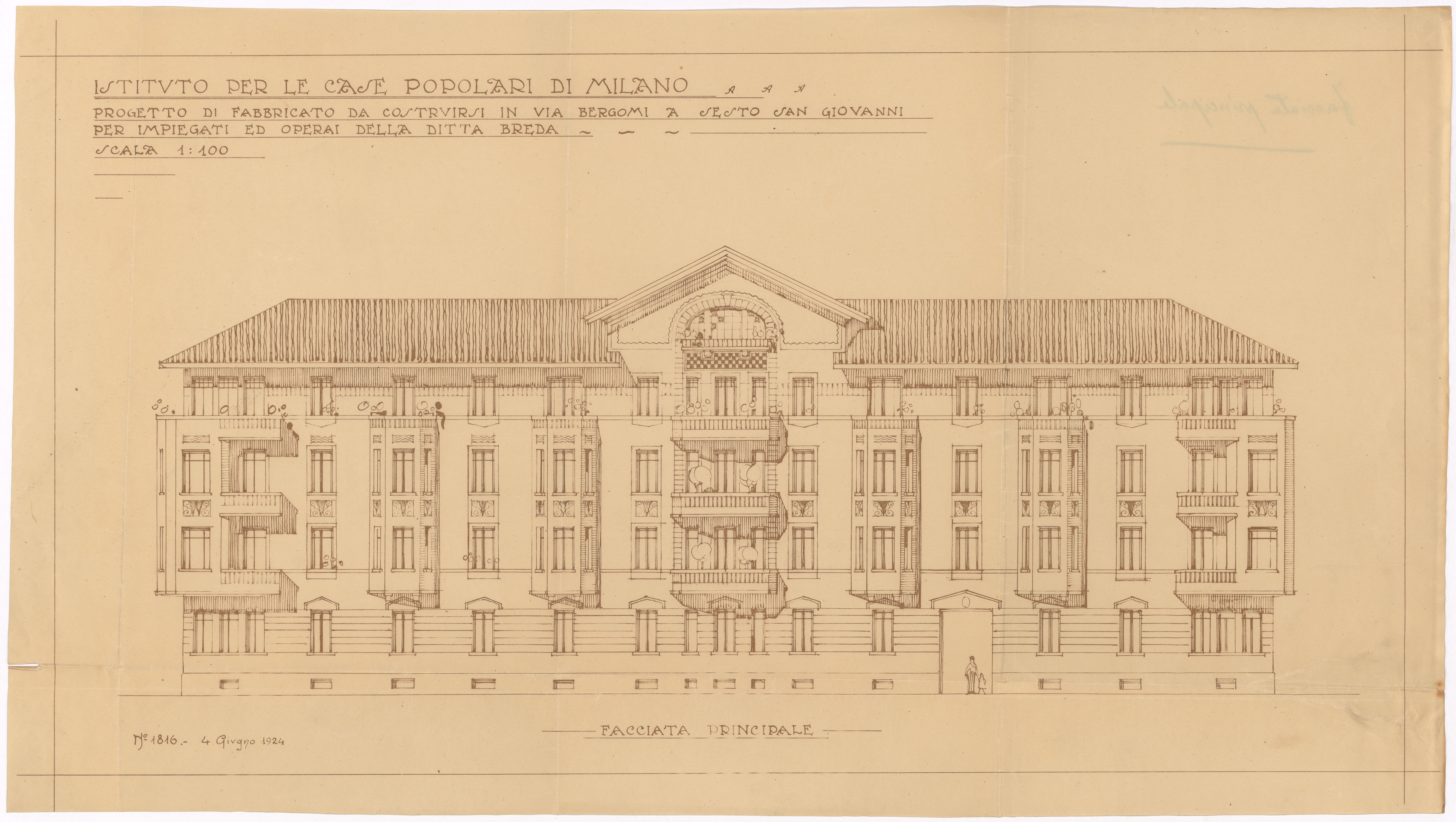 La prima Guerra mondiale aveva interrotto i “progetti di ampliamenti già prossimi ad essere attuati” (ivi), ma dal 1920, grazie a un accordo finanziario con l’Istituto autonomo delle case popolari (Iacp) di Milano, l’attività edilizia era ripresa. Tra il 1920 e il 1925 furono costruite su progetto di Broglio nove cosiddette “casine”, con impianto a T e due alloggi con ingresso indipendente: sei monopiano per capi operai e tre a due piani per impiegati; ogni edificio era dotato di giardino. Tipologicamente, il complesso costituiva un vero e proprio villaggio che si ispirava alle “città giardino” già sperimentate e realizzate da Broglio in diversi quartieri di Milano (Villaggio “La Postelegrafonica” in viale Zara, Villaggio giardino “Campo dei Fiori”, tra Villapizzone e la Ghisolfa, e Villaggio giardino “Gran Sasso”, nei pressi di piazzale Piola) e costruite dallo Iacp. Significativamente, nell’aprile del ‘25, la Sieb concludeva un accordo con l’Istituto delle case popolari in base al quale aumentava “la propria quota di conferimento del capitale di questo Istituto da lire 430.000 a L. 900.000 allo scopo di dare ulteriore sviluppo al programma di costruzioni popolari in Sesto San Giovanni, studiate di comune accordo. Precisamente detto aumento verrà destinato, insieme al mutuo che questo Istituto avrà cura di assumere, alla costruzione da iniziarsi subito di una grande casa a più piani, ad esclusivo scopo di abitazione, sull’area che questo Istituto si è assicurata fra le vie Bergomi e Marconi, adiacenti al secondo gruppo di casette costruite nel 1922” (lettera del 18 aprile 1925, in Archivio Fondazione ISEC, fondo Breda IV sez. – Dean). Anche l’edificio a cui si faceva cenno nella lettera era stato progettato da Broglio. Con il prospetto principale lungo la via Bergomi esso aveva un corpo con timpano centrale, quattro piani fuori terra, un basamento in materiale cementizio al piano terra coronato da una cornice marcapiano che allineava i davanzali del primo piano. La facciata era elegantemente scandita in verticale dalla presenza di finestre aggettanti tra primo e secondo piano.