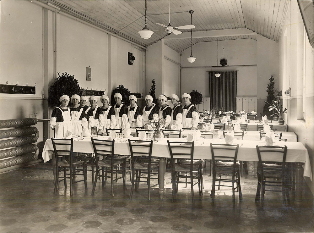 Le origini della ristorazione aziendale vengono fatte risalire a Robert Owen e alla creazione attorno al cotonificio di New Lanarck in Scozia di una serie di servizi per il lavoratori¹. Si era all’inizio dell’Ottocento, e da allora dovette passare oltre un secolo prima che anche in Italia si ponesse il problema di offrire un locale dove i lavoratori e le lavoratrici potessero consumare il cibo che si portavano da casa, nel fagotto o in un pentolino. Fino a quel momento il “mangiare” era una necessità che veniva espletata dall’operaio in fretta, quasi sempre in piedi, in mezzo ai macchinari e con le mani sporche di grasso. In diverse imprese, a partire da quelle che sorgevano al di fuori dei centri abitati, cominciò a diffondersi la presenza di locali in cui gli operai potevano scaldare e poi consumare il cibo portato da casa. Sono i cosiddetti refettori, locali riscaldati e dotati di grandi tavoli di legno dove ci si riuniva per mangiare. Il passaggio ulteriore sarà la mensa, ovvero il servizio di preparazione del pasto da parte dell’azienda. Il diritto di consumare un pasto, cucinato appositamente in uno spazio dedicato e organizzato è stato l’ultimo stadio di una lenta conquista, direttamente proporzionale allo sviluppo industriale che ha significato un progressivo miglioramento delle condizioni di lavoro.