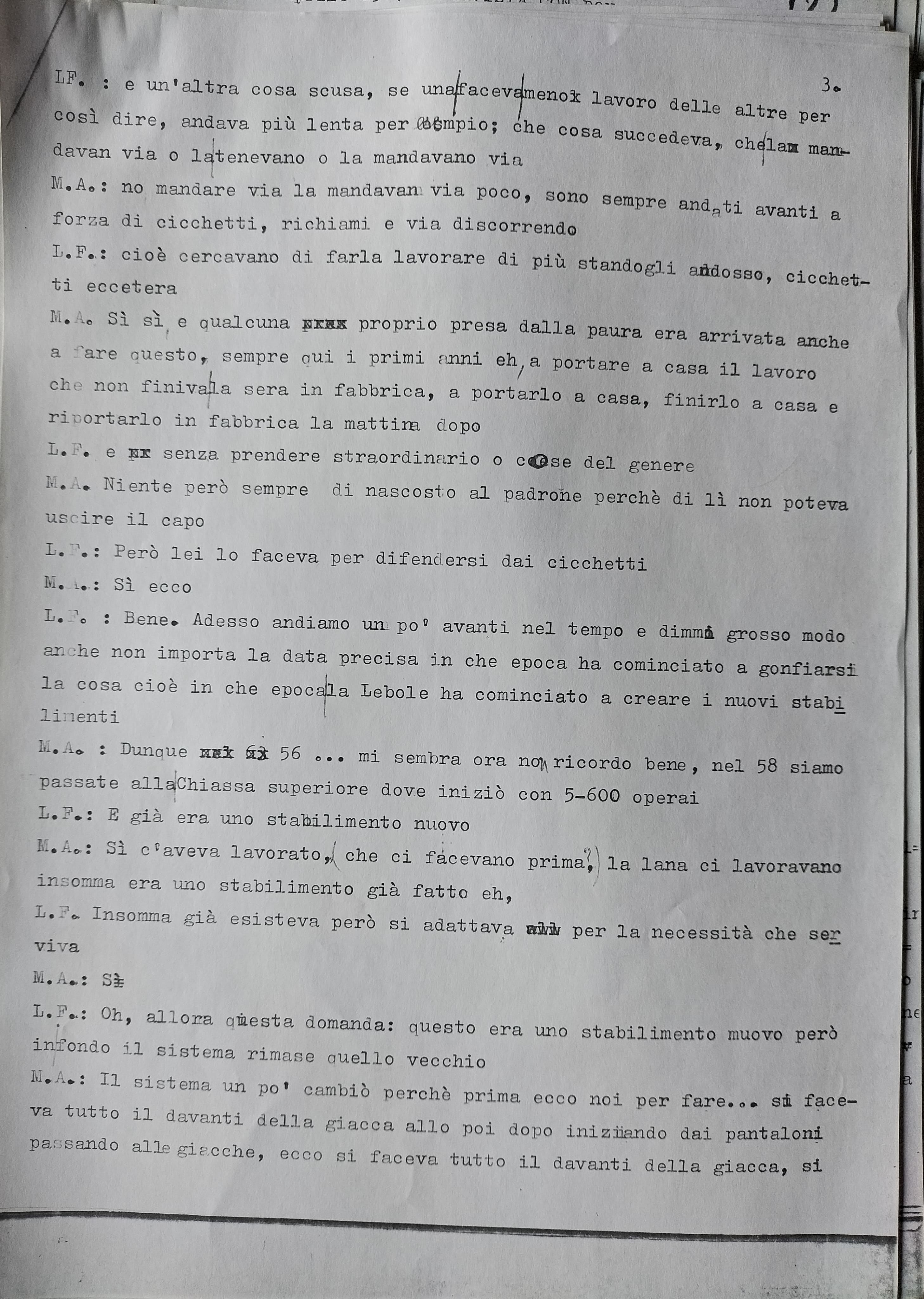 Nelle interviste alle lavoratrici della Lebole, la griglia delle domande segue queste direttrici: com’è cambiata e quali effetti ha prodotto l’organizzazione del lavoro, di quanto è aumentata la produzione, come hanno agito e con quali risultati i sindacati, quale il ruolo del Partito comunista.