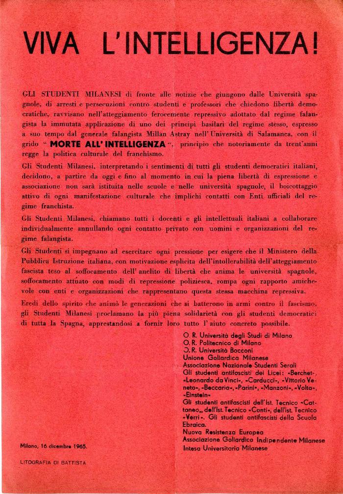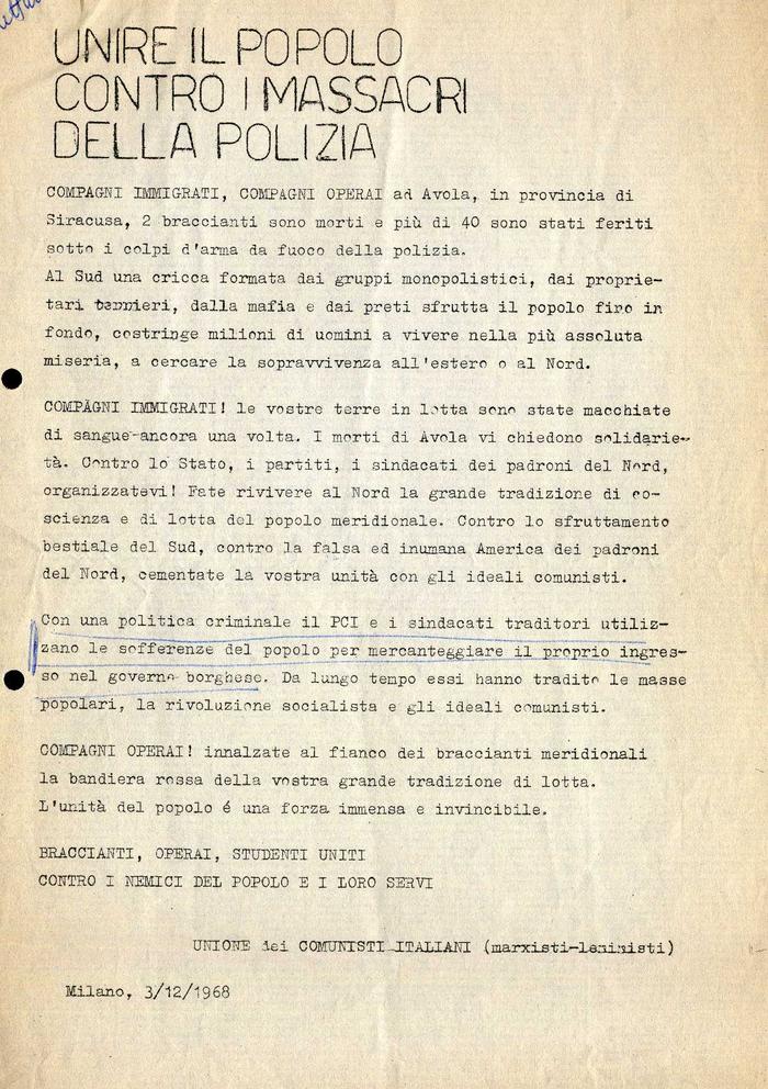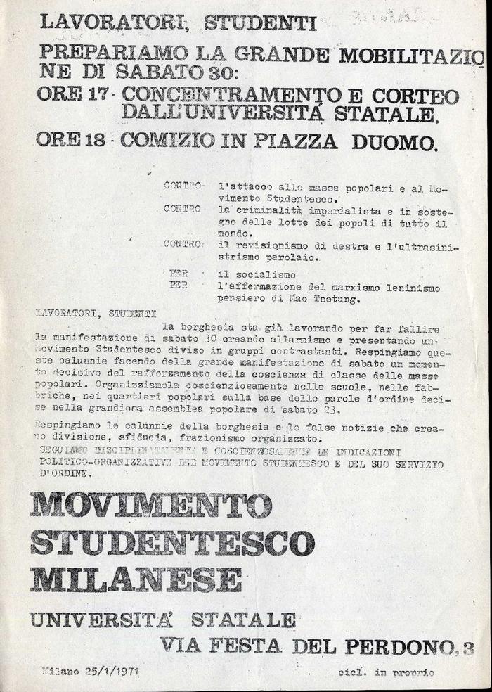 È da questi giorni consultabile sulla piattaforma digitale dell’archivio una prima selezione delle migliaia di volantini dispersi nei vari fondi. Si tratta di materiali fragili, tirati al ciclostile su carta spesso scadente, in genere prodotti da gruppi e movimenti politico-sociali poco strutturati, per i quali la digitalizzazione si è rivelata particolarmente necessaria. La raccolta contiene alcune centinaia di volantini del periodo 1943-45 conservati nel Fondo Fontanella, e diverse centinaia di volantini autoprodotti degli anni 1966-1980, partendo da quelli del Movimento Studentesco milanese, contenuti soprattutto nei Fondi Haim Burstin e Stefano Canzi.