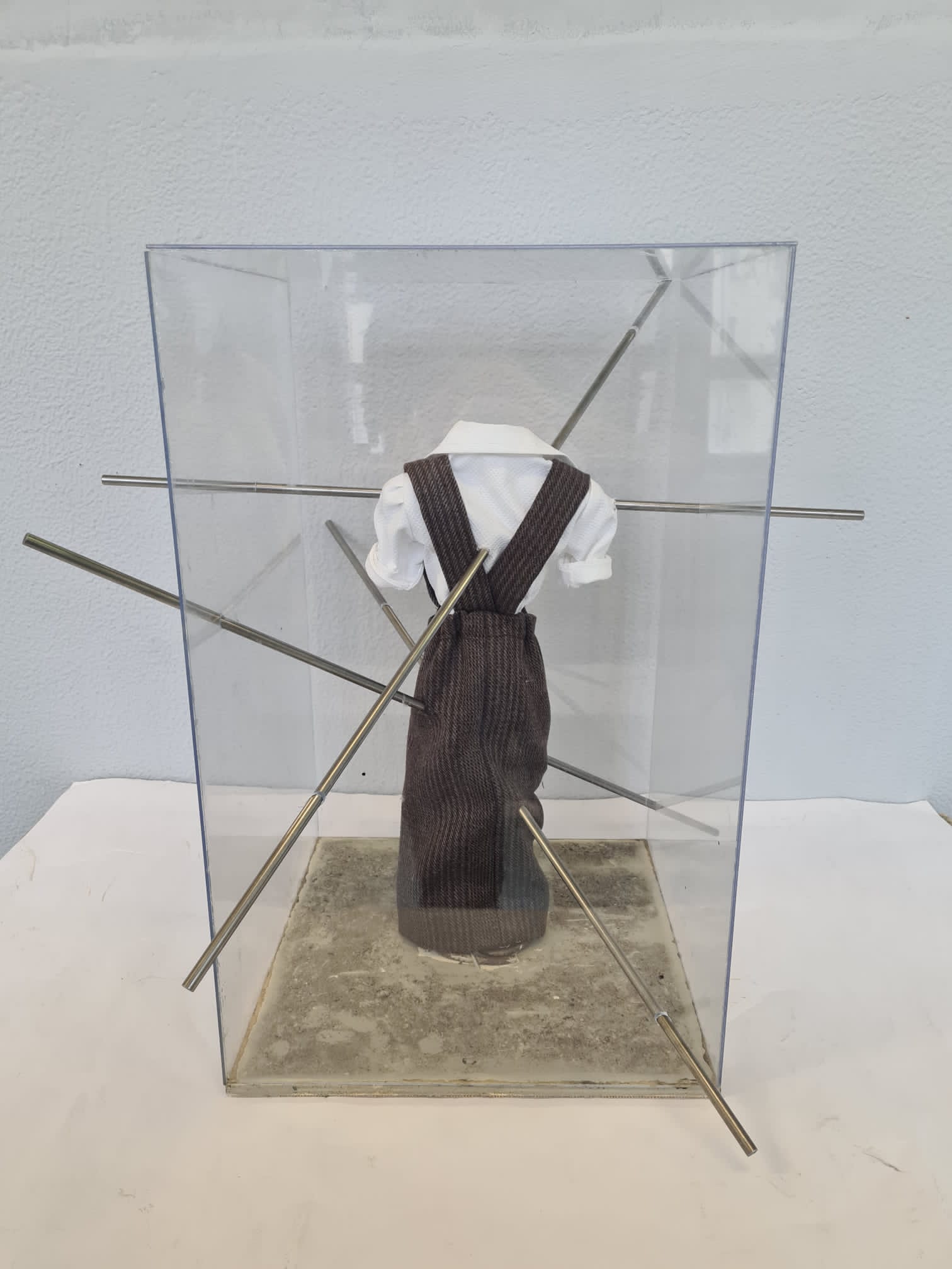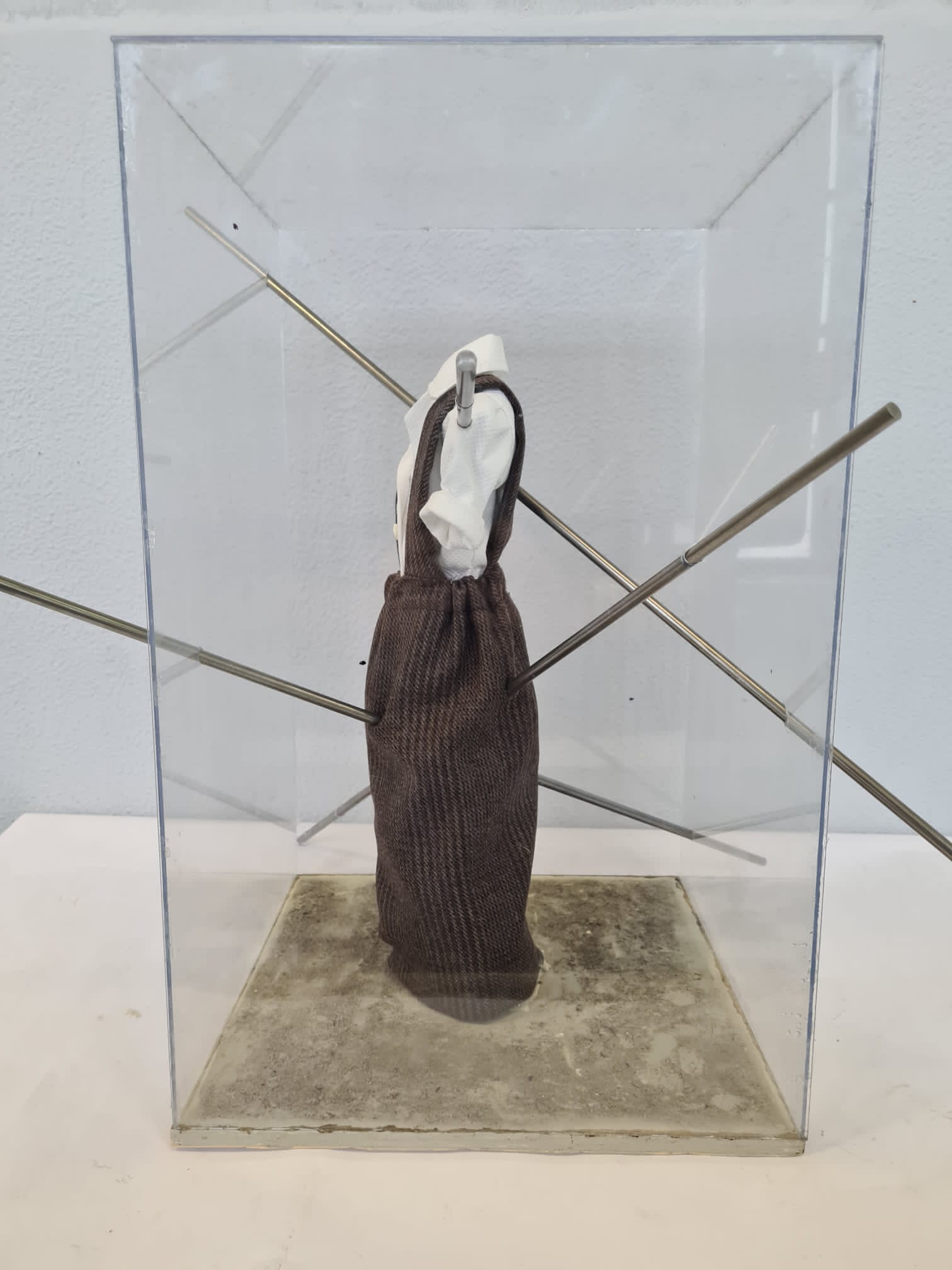 Per indicare la gabbia della società dalla quale non potevano uscire la divisa è stata posta all'interno di una teca di plexiglass; entrambe vengono trapassate da tondini di ferro rappresentanti le ingiustizie e le sofferenze subite dalle donne.