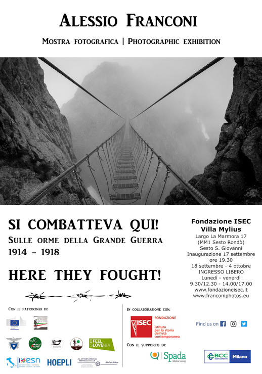 Fondazione ISEC vi invita alla mostra fotografica di Alessio Franconi, una selezione di scatti che raccontano il fronte Italo-Austroungarico durante la Prima guerra mondiale: la mostra, dedicata al ricordo dei caduti, illustra le cicatrici lasciate nel terreno sui campi di battaglia lungo l’arco alpino dalla Slovenia alla Lombardia, fino ai Monti Carpazi.