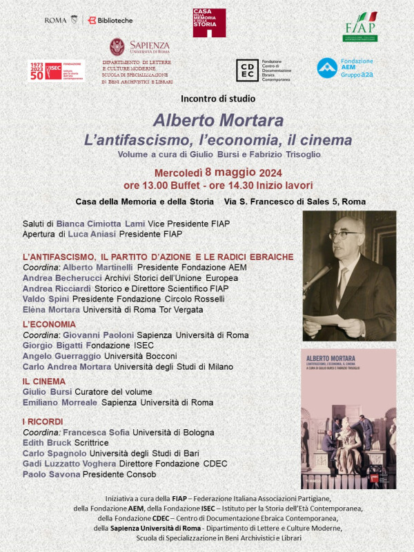 Incontro di studio sul volume Alberto Mortara: l'antifascismo, l'economia, il cinema MERCOLEDI’ 8 MAGGIO 2024 CASA DELLA MEMORIA E DELLA STORIA Via San Francesco di Sales, 5 – ROMA Iniziativa a cura della FIAP – Federazione Italiana Associazioni Partigiane, della Fondazione AEM, della Fondazione …