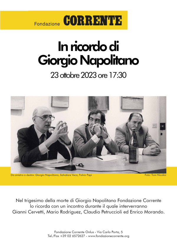 Nel trigesimo della morte di Giorgio Napolitano, Fondazione Corrente lo ricorda con un incontro durante il quale interverranno Gianni Cervetti, Mario Rodriguez, Claudio Petruccioli ed Enrico Morando. Fondazione Corrente (via Carlo Porta 5, Milano) 23 ottobre 17:30.