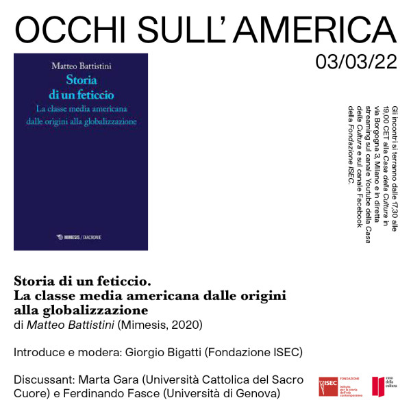 Fondazione ISEC e Casa della Cultura presentano il primo incontro del ciclo di presentazioni "Occhi sull'America". Il 3 Marzo 2022 dalle 17:30 alle 19:00 presso la Casa della Cultura (via Borgogna 3, Milano): Storia di un feticcio. La classe media americana dalle origini alla globalizzazione di …