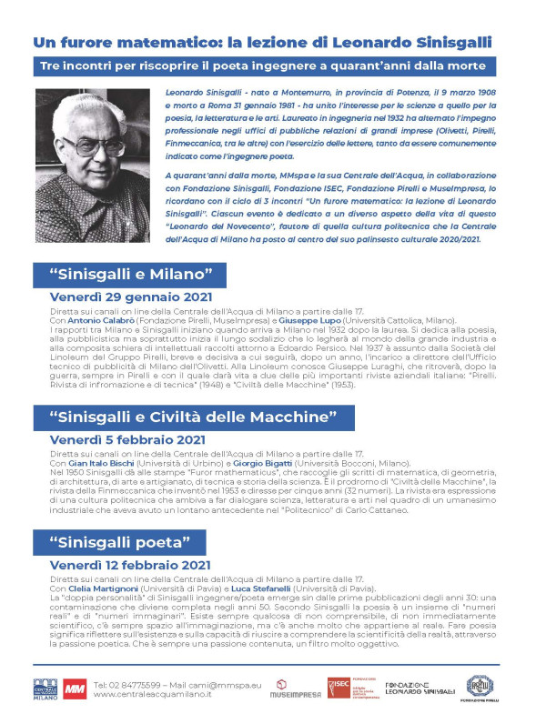 Nell’ambito del ciclo di 3 incontri “Un furore matematico: la lezione di Leonardo Sinisgalli”, promosso da Centrale dell’acqua di Milano e MM Spa, in collaborazione con Fondazione Sinisgalli, Fondazione ISEC, Fondazione Pirelli e Museimpresa, vi invitiamo al webinar sulla figura di Sinisgalli …