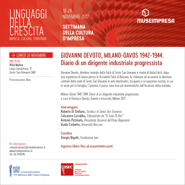 In occasione della XVI Settimana della cultura d’impresa, promossa da Confindustria e Museimpresa, dedicata al tema “Linguaggi della crescita: impresa, cultura, territorio”, Fondazione ISEC promuove la presentazione del volume di Giovanni Devoto, Milano-Davos 1942-1944. Diario di un dirigente …