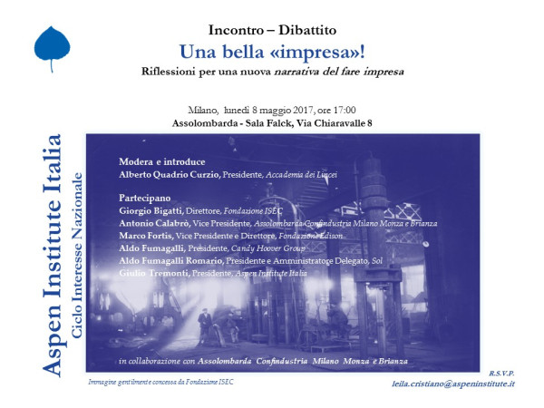 Modera e introduce: Alberto Quadrio Curzio, Accademia dei Lincei Intervengono: Giorgio Bigatti, Fondazione ISEC Antonio Calabrò, Assolombarda Confindustria Milano Monza e Brianza Marco Fortis, Fondazione Edison Aldo Fumagalli, Candy Hoover Group Aldo Fumagalli Romario, Sol Giulio Tremonti, Aspen …
