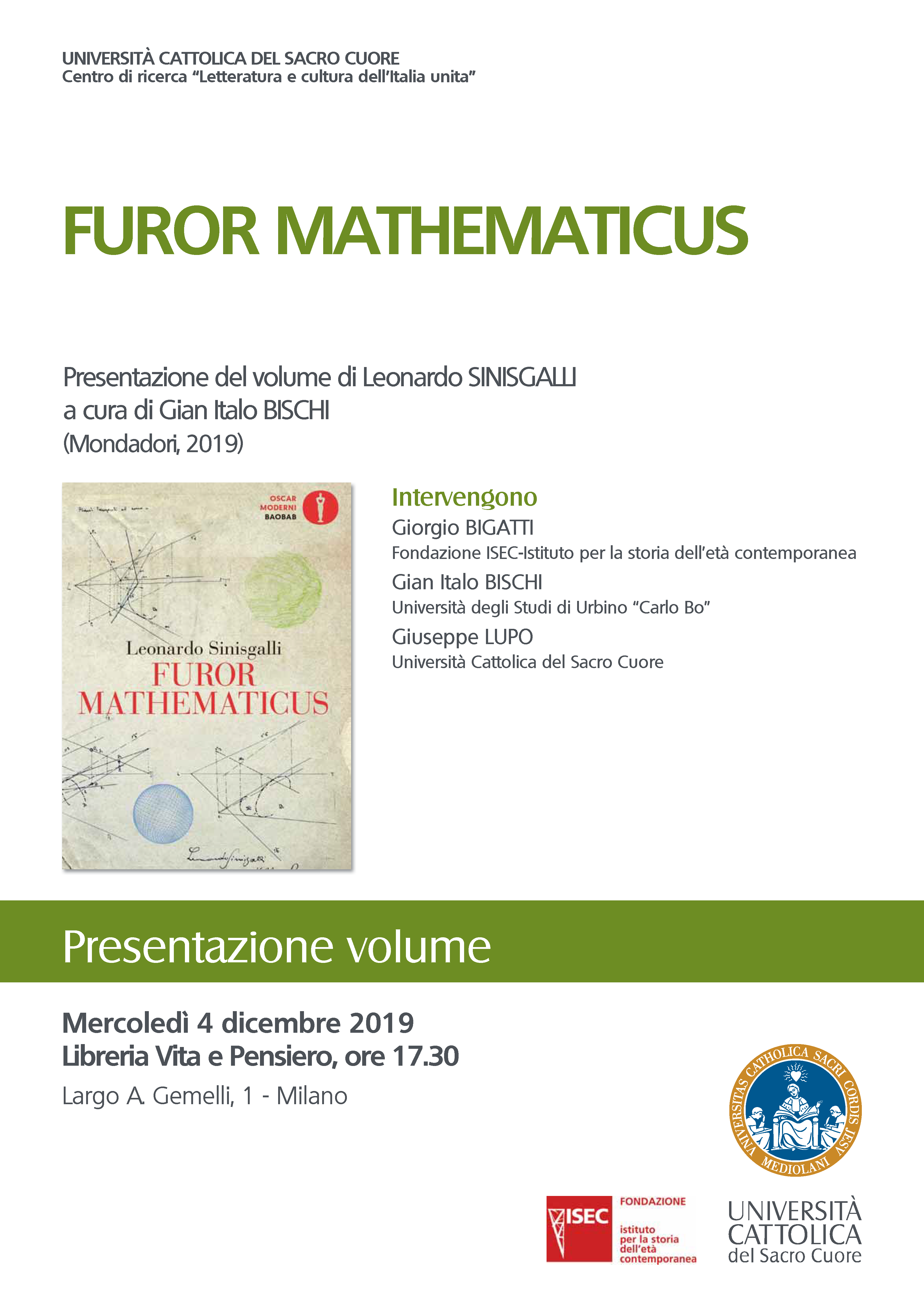 Fondazione ISEC e Università cattolica di Milano vi invitano alla presentazione del volume “Furor Mathematicus” di Leonardo Sinisgalli, a cura di Gian Italo Bischi (Mondadori, 2019).