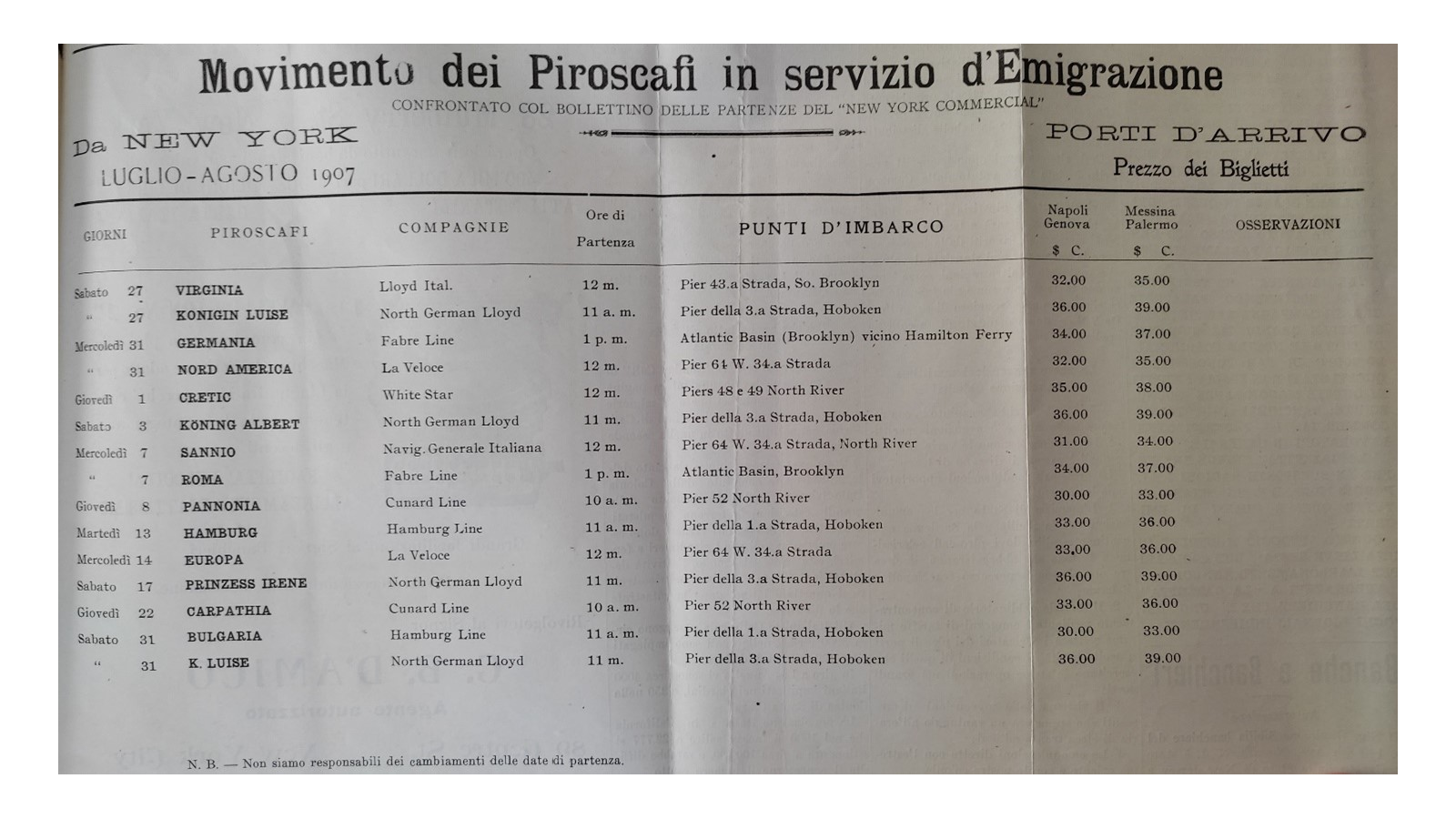 L’8 maggio 1907 l’avvocato napoletano Guglielmo Emanuele di Palma dei conti Castiglione – nato nel 1879, volontario nel 1897 nella Legione Cipriani per la guerra greco-turca, dottore in legge a Torino nel 1900, frequentatore dei corsi di Scienze sociali tenuti da Maffeo Pantaleoni all’Università di Ginevra, volontario di guerra nel 1915 – si imbarcava a Napoli sul piroscafo “Europa” alla volta di New York.