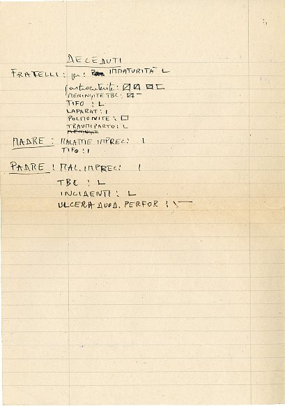 Nel 1949-50, anni in cui molti vivevano ancora nelle baracche degli sfollati e la città era in buona parte ancora da ricostruire, Cantoni prestava servizio nei quartieri della periferia ovest di Milano: piazzale Selinunte, Trenno, Lampugnano, Figino e Quinto Romano. Nel suo archivio sono conservati gli appunti a mano relativi alle ispezioni. In una serie di fogli protocollo risalenti agli inizi degli anni ’50 sono registrate le malattie e le disabilità presenti nella popolazione scolastica da lui esaminata; sono censite la tbc polmonare e ossea, la bronchite asmatica, cardiopatie, malattie della pelle, malattie degli occhi, endocrinopatie, malattie infettive, lesioni varie, disturbi psichici e problemi di deambulazione. Inoltre una serie di appunti a mano fotografano la situazione delle classi in cui era stata condotta l’indagine, con un’attenzione anche ai componenti del nucleo familiare. Prendiamo per esempio l’indagine relativa alle classi prime nella scuola elementare di Baggio, in cui emerge il gran numero dei familiari deceduti per malattia, in particolare dei fratelli dei piccoli scolari: due neonati deceduti “per immaturità”, diciotto ragazzi morti per gastroenterite, sei per meningite, due di tifo, quattro di polmonite, due in seguito a trauma durante il parto. Colpisce anche l’esame del rapporto fra l’ampiezza del nucleo familiare e il numero dei vani abitativi: a quanto risulta dagli appunti di Cantoni, su 58 bambini 34 vivevano in famiglie composte da cinque fino a dieci membri costretti in uno, due o al massimo tre vani. Il quadro che emerge, inutile dirlo, è quello di una situazione di diffusa precarietà economica, sociale e sanitaria.