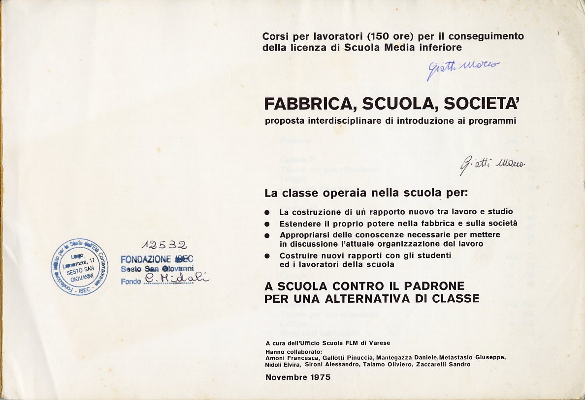 Quella che segue è, invece, la copertina interna di un libro del novembre 1975 che raccoglie i programmi dei corsi per lavoratori per il conseguimento della licenza di scuola media inferiore organizzati dalla Federazione Lavoratori Metalmeccanici di Varese. La pagina riporta schematicamente gli obiettivi generali di questi corsi. All’interno del libro si trovano materiali e letture relative alla storia della scuola e dell’alfabetizzazione, dati sui meccanismi di selezione vigenti e riflessioni sul rapporto scuola-società; e poi, ancora, interventi sui temi del lavoro, della condizione della donna lavoratrice, delle migrazioni interne e internazionali, dove il racconto della propria esperienza è sempre il punto di partenza per percorsi di approfondimento più generali.