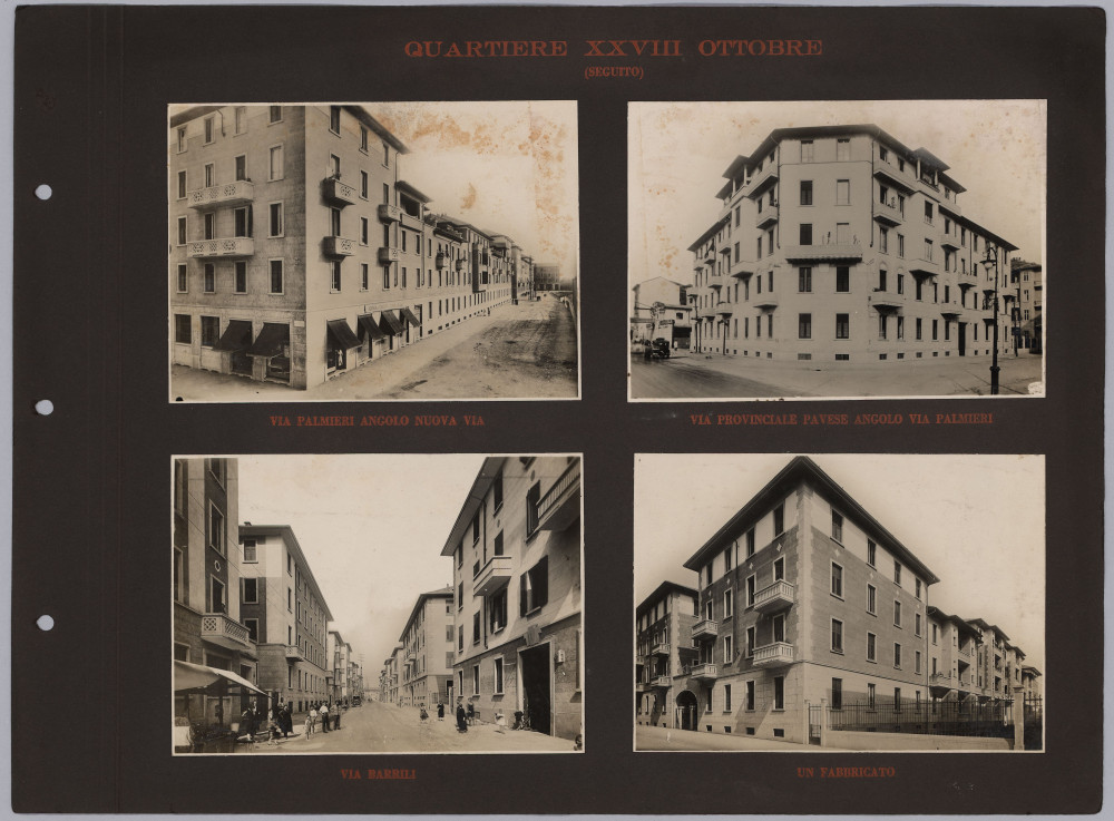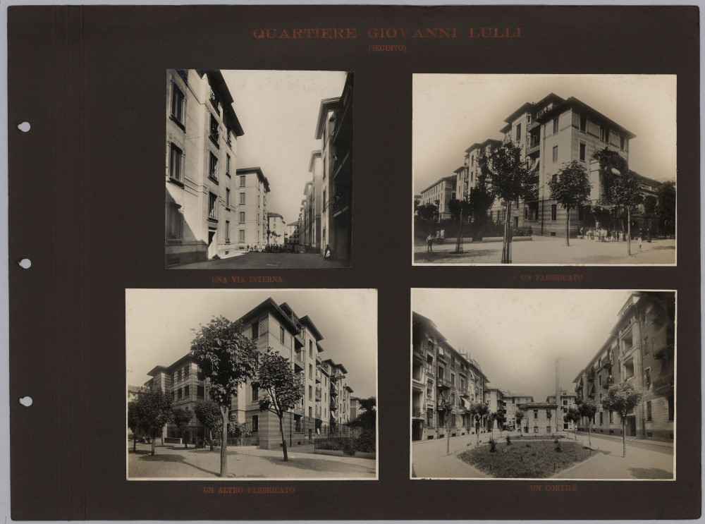 Pur non riportando altre informazioni oltre al titolo, l’album è con ogni probabilità opera dell’Istituto Autonomo Case Popolari. Esso appare come la prosecuzione e l’aggiornamento di un testo del 1929 – L’Istituto per le case popolari di Milano e la sua opera tecnica dal 1909 al 1929 – scritto e curato da Giovanni Broglio, in quegli anni a capo dell’ufficio tecnico dell’Istituto Autonomo per le Case Popolari di Milano. Anche questo testo, come l’album fotografico, contiene numerose immagini delle realizzazioni fatte da IACP, molte ritornano identiche nelle due pubblicazioni. Questo ci permette di risalire al fotografo che le ha realizzate, Antonio Paoletti: di origini livornesi, nella prima metà del ‘900 lavorò a Milano collaborando con numerose istituzioni pubbliche (Castello Sforzesco, Museo archeologico, Galleria d’Arte moderna), aziende (AEM e Edison Volta) e anche con l’Istituto fascista per le Case Popolari.