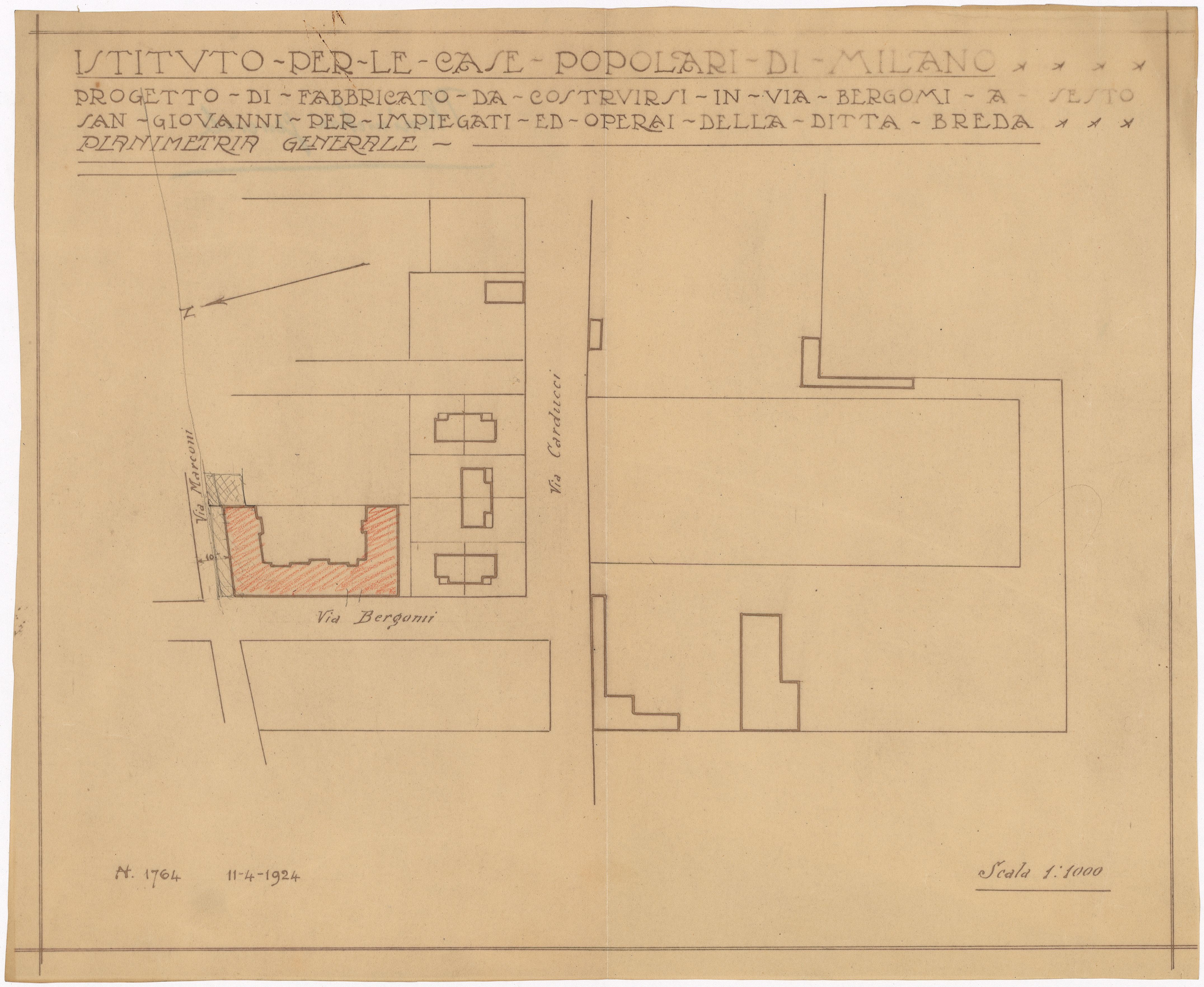 La prima Guerra mondiale aveva interrotto i “progetti di ampliamenti già prossimi ad essere attuati” (ivi), ma dal 1920, grazie a un accordo finanziario con l’Istituto autonomo delle case popolari (Iacp) di Milano, l’attività edilizia era ripresa. Tra il 1920 e il 1925 furono costruite su progetto di Broglio nove cosiddette “casine”, con impianto a T e due alloggi con ingresso indipendente: sei monopiano per capi operai e tre a due piani per impiegati; ogni edificio era dotato di giardino. Tipologicamente, il complesso costituiva un vero e proprio villaggio che si ispirava alle “città giardino” già sperimentate e realizzate da Broglio in diversi quartieri di Milano (Villaggio “La Postelegrafonica” in viale Zara, Villaggio giardino “Campo dei Fiori”, tra Villapizzone e la Ghisolfa, e Villaggio giardino “Gran Sasso”, nei pressi di piazzale Piola) e costruite dallo Iacp. Significativamente, nell’aprile del ‘25, la Sieb concludeva un accordo con l’Istituto delle case popolari in base al quale aumentava “la propria quota di conferimento del capitale di questo Istituto da lire 430.000 a L. 900.000 allo scopo di dare ulteriore sviluppo al programma di costruzioni popolari in Sesto San Giovanni, studiate di comune accordo. Precisamente detto aumento verrà destinato, insieme al mutuo che questo Istituto avrà cura di assumere, alla costruzione da iniziarsi subito di una grande casa a più piani, ad esclusivo scopo di abitazione, sull’area che questo Istituto si è assicurata fra le vie Bergomi e Marconi, adiacenti al secondo gruppo di casette costruite nel 1922” (lettera del 18 aprile 1925, in Archivio Fondazione ISEC, fondo Breda IV sez. – Dean). Anche l’edificio a cui si faceva cenno nella lettera era stato progettato da Broglio. Con il prospetto principale lungo la via Bergomi esso aveva un corpo con timpano centrale, quattro piani fuori terra, un basamento in materiale cementizio al piano terra coronato da una cornice marcapiano che allineava i davanzali del primo piano. La facciata era elegantemente scandita in verticale dalla presenza di finestre aggettanti tra primo e secondo piano.