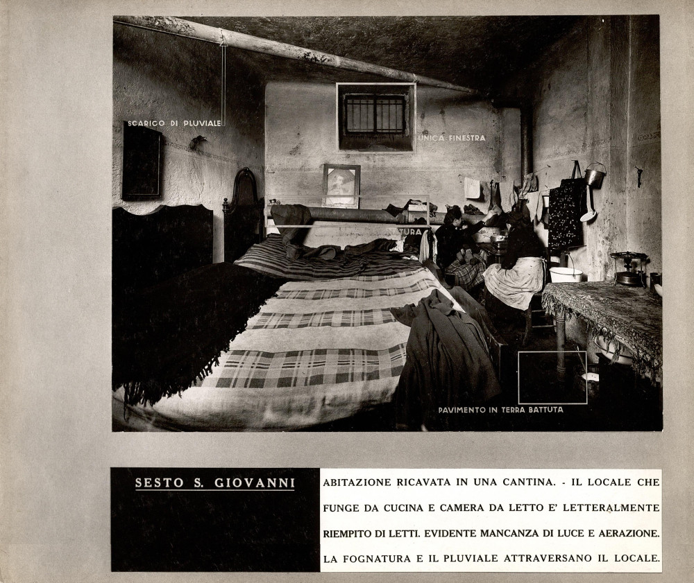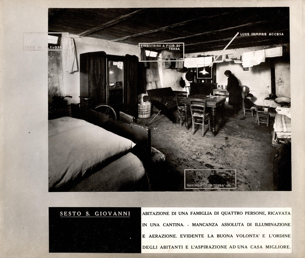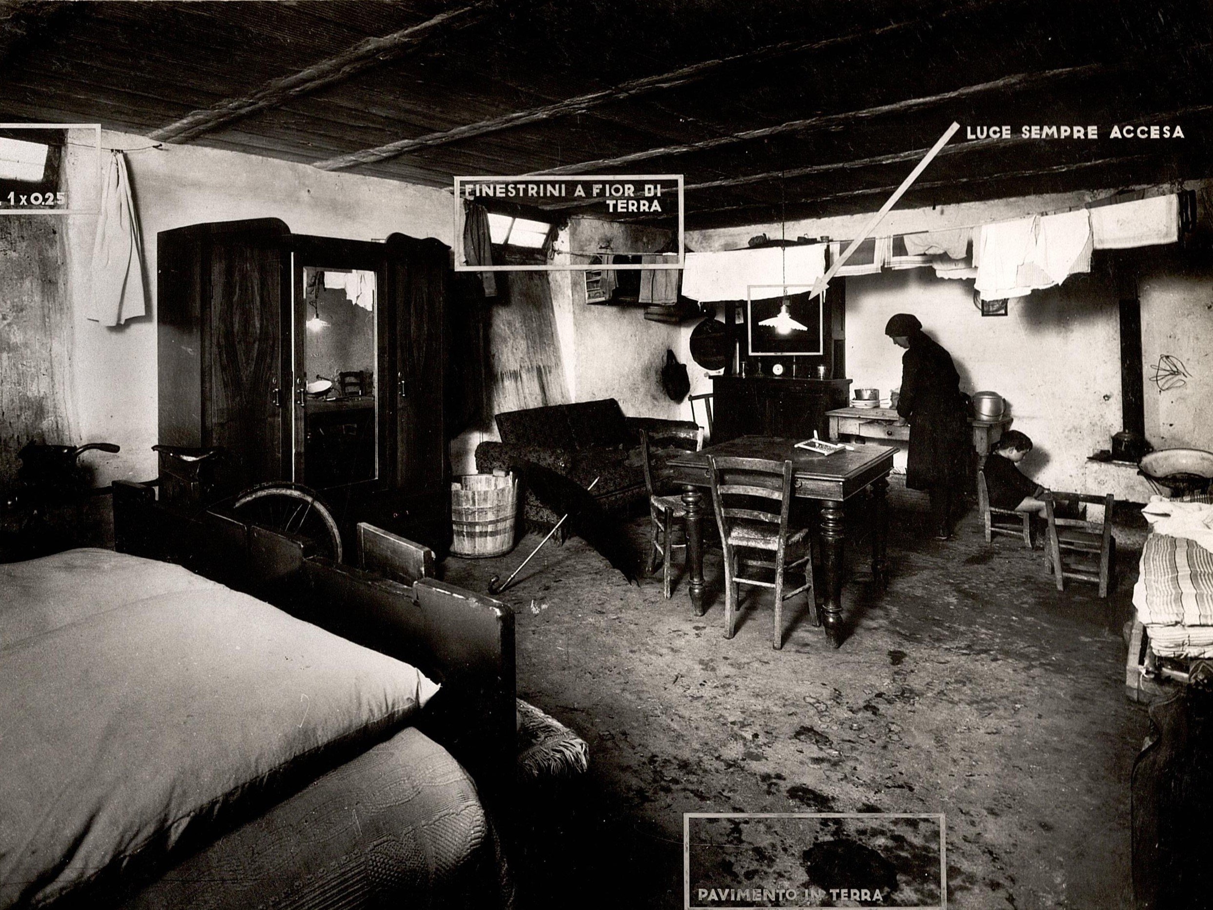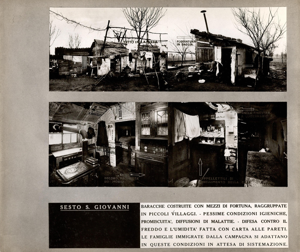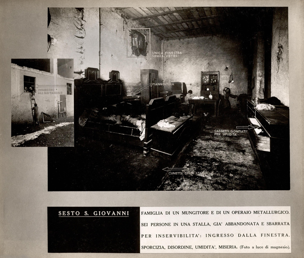 Per questo tanto più interessante appare la decisione da parte dell’amministrazione provinciale di Milano, per volontà esplicita del suo preside, l’industriale Franco Marinotti, di affidare a due giovani architetti – «ben noti per la loro competenza nel campo dell’urbanistica e dell’edilizia popolare» dirà Giuseppe Pagano su «Casabella Costruzioni» –, un’Indagine sul problema della abitazione operaia nella provincia di Milano e proposte per la sua soluzione. Motivata dalla volontà di contribuire a «ridurre la pressione dell’urbanesimo» verso Milano favorendo il «decentramento operaio» in linea quindi con le scelte del regime, l’indagine si inseriva però in un disegno, destinato a rimanere sulla carta, di pianificazione territoriale a scala metropolitana. Un’analisi delle infrastrutture e del sistema di trasporto a scala provinciale aveva evidenziato il peso crescente dei flussi pendolari verso Milano, pari a circa 700.000 lavoratori al giorno, e la disordinata espansione dell’area a nord del capoluogo, con un evidente parallelismo fra crescita della popolazione e sovraffollamento degli alloggi. Uno dei punti di maggiore criticità di questo rapporto era il comune di Sesto San Giovanni, «centro esclusivamente industriale», dove per rispondere alla domanda di un tetto da parte della popolazione richiamata dallo sviluppo dell’industria siderurgica e meccanica si era determinata «la necessità di trasformare le case già adibite a funzioni rurali e semirurali in case di abitazioni operaie». Su una popolazione di circa 40.000 abitanti si calcolava che vi fossero «oltre 6000 persone senza un alloggio degno di tal nome», costrette a vivere in «condizioni intollerabili» di degrado «igienico, sociale ed umano cui occorreva provvedere con urgenza ed energia». Non è qui il luogo per approfondire gli aspetti progettuali dello studio di Bottoni e Pucci e in particolare alla planimetria e alla tipologia degli interventi proposti: un «quartiere operaio intensivo» lungo il viale Lombardia, un villaggio operaio in prossimità di Cascina Gatti e un altro «villaggio operaio-tipo al confine con l’autostrada Milano Bergamo». Progetti a giudizio di Pagano in grado di «conciliare le ragioni tecniche dell’economia e della razionale disposizione urbanistica con quelle dell’arte», a differenza dai troppi interventi distribuiti «a casaccio nei ritagli disponibili delle aree demaniali». Un punto almeno merita di essere richiamato. I risultati di tale indagine non potevano suonare graditi al preside della provincia che, dopo averla commissionata, non se la sentì di bloccare la pubblicazione (Fondazione ISEC conserva copia dell’opuscolo di difficile reperibilità Il problema delle abitazioni operaie nella provincia di Milano e proposte per la creazione di borgate semirurali, Milano, 1939). Si limitò a eliminare ciò che più delle parole rendeva di plastica evidenza cosa fossero le «condizioni intollerabili» di degrado «igienico, sociale ed umano» rilevate dai due giovani architetti. L’indagine originale era corredata da una straordinaria documentazione fotografica realizzata dallo stesso Piero Bottoni che documentava la realtà di condizioni abitative certamente non nuove per le classi popolari ma inconciliabili con la retorica e l’immagine di modernità che il regime ambiva a dare di sé, come documentano le fotografie qui riprodotte per gentile concessione dell’Archivio Piero Bottoni (Dastu, Politecnico di Milano).