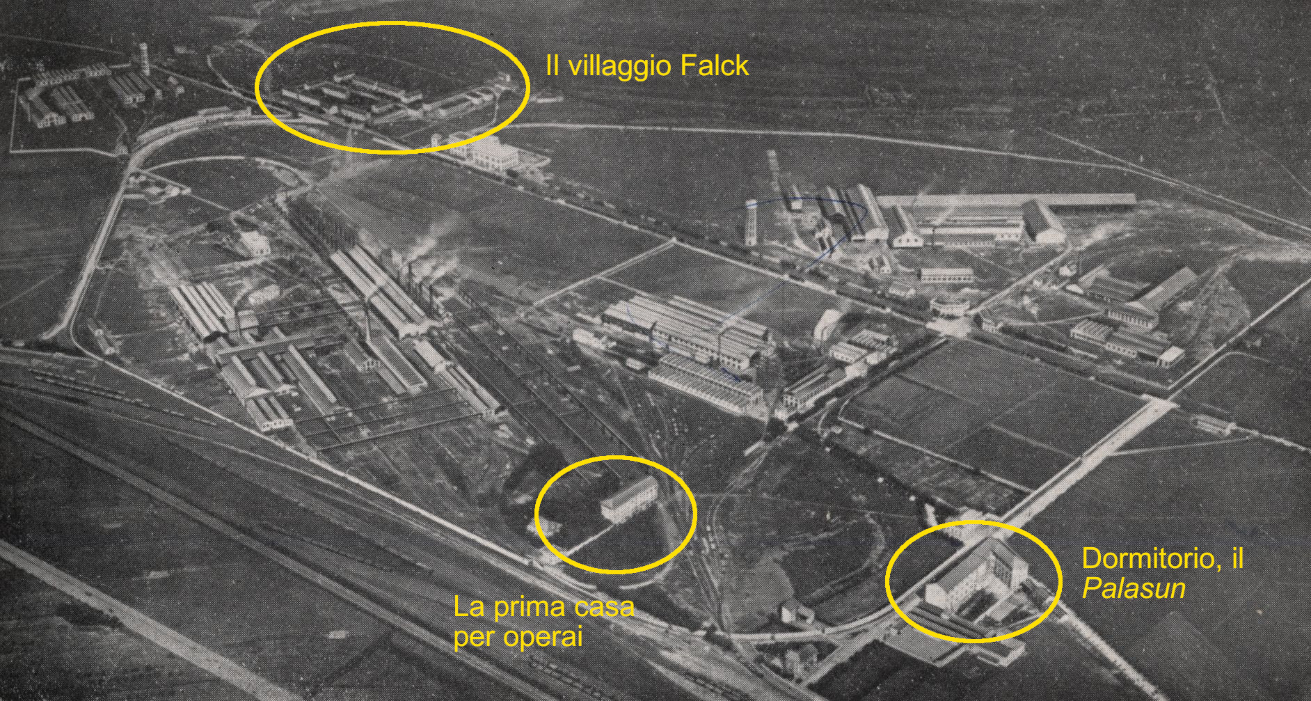 Nel primo dopoguerra lo sviluppo delle industrie siderurgiche, la cui organizzazione del lavoro si basava su turni con mano d’opera immigrata o pendolare proveniente dalle aree prealpine, comportò la costruzione di grandi dormitori: un esempio è il Dormitorio Falck detto popolarmente “Palasùn”, in via Mazzini prospicente sulla portineria dello stabilimento Unione. Alla fine degli anni Venti, la società disponeva di altri 7 dormitori per complessivi 1.000 posti letto.