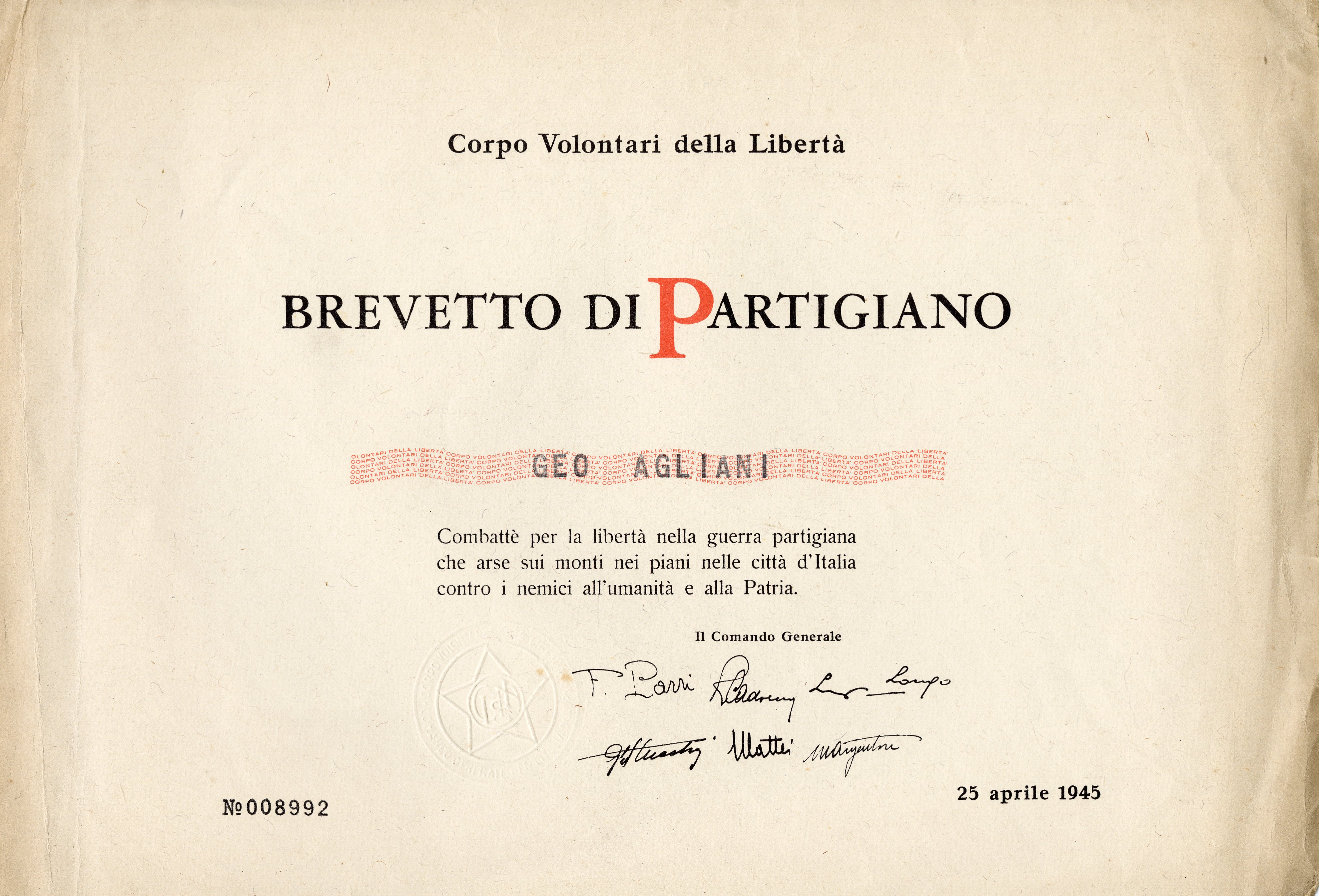 Brevetto di Partigiano (b.1, fasc. 2)