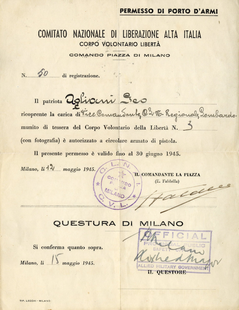 Dopo l’8 settembre, fu da subito impegnato nelle Brigate Garibaldi, in cui svolse un ruolo di rilievo (si vedano le tessere di riconoscimento e l’attestato di partecipazione alla guerra partigiana conservate nel fondo); in seguito, divenne vicecomandante regionale del CVL lombardo. Con il termine della guerra partigiana e lo scioglimento del CVL, Agliani fu appuntato responsabile dell’Ufficio stralcio del CVL lombardo. L’ufficio, a cui corrispondevano organi analoghi a ogni livello della macchina organizzativa della Resistenza, in via di smantellamento, aveva il compito di smistare presso gli organi competenti (questure, prefetture, Comitati provinciali ANPI) le pratiche ancora aperte che dopo la Liberazione erano state prese in carico dal CVL regionale. In molti casi si trattava di denunce di irregolarità, di azioni arbitrarie, segnalazioni di sedicenti partigiani in realtà invischiati o fiancheggiatori del passato regime e dispute di ogni tipo.