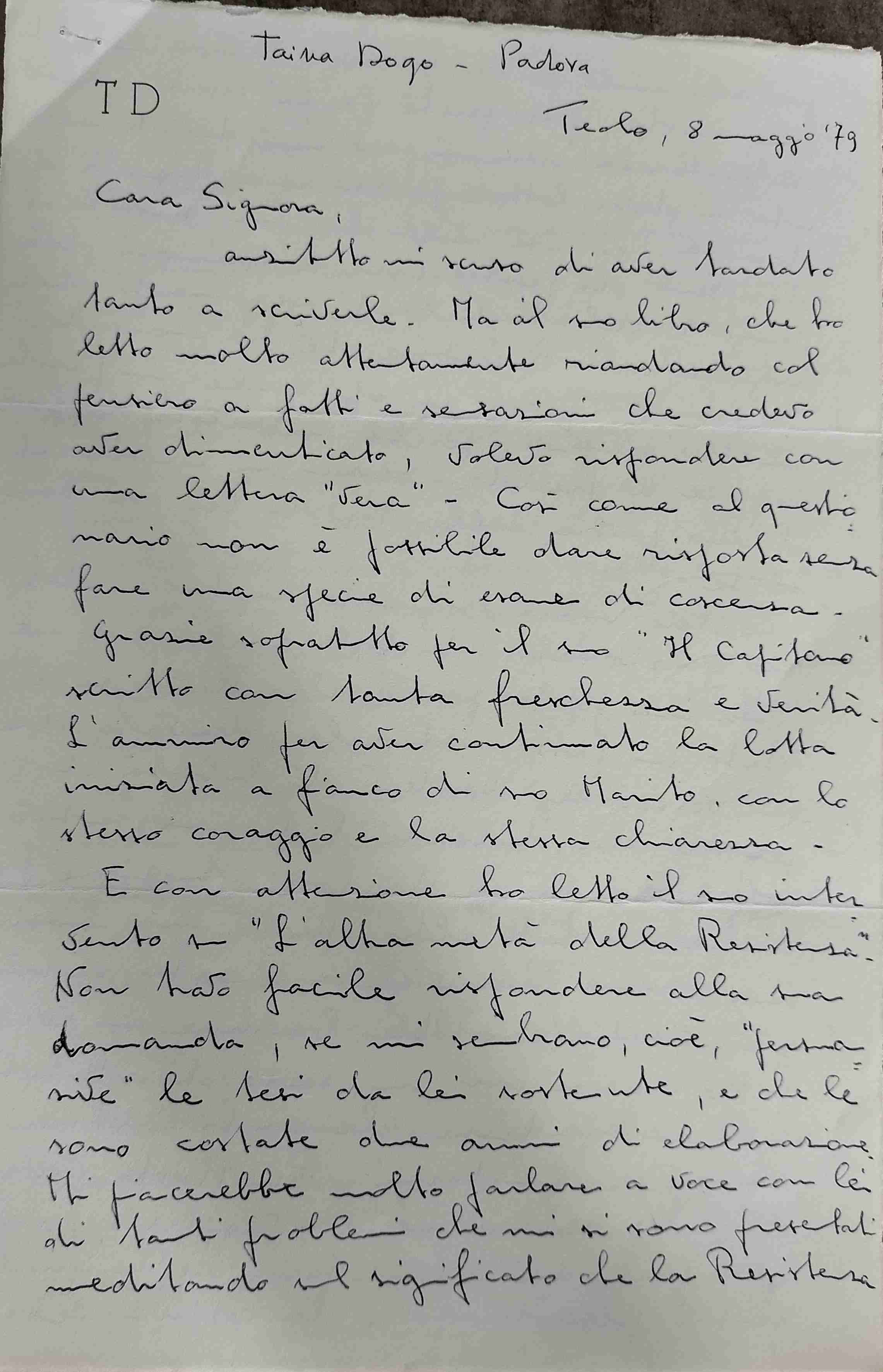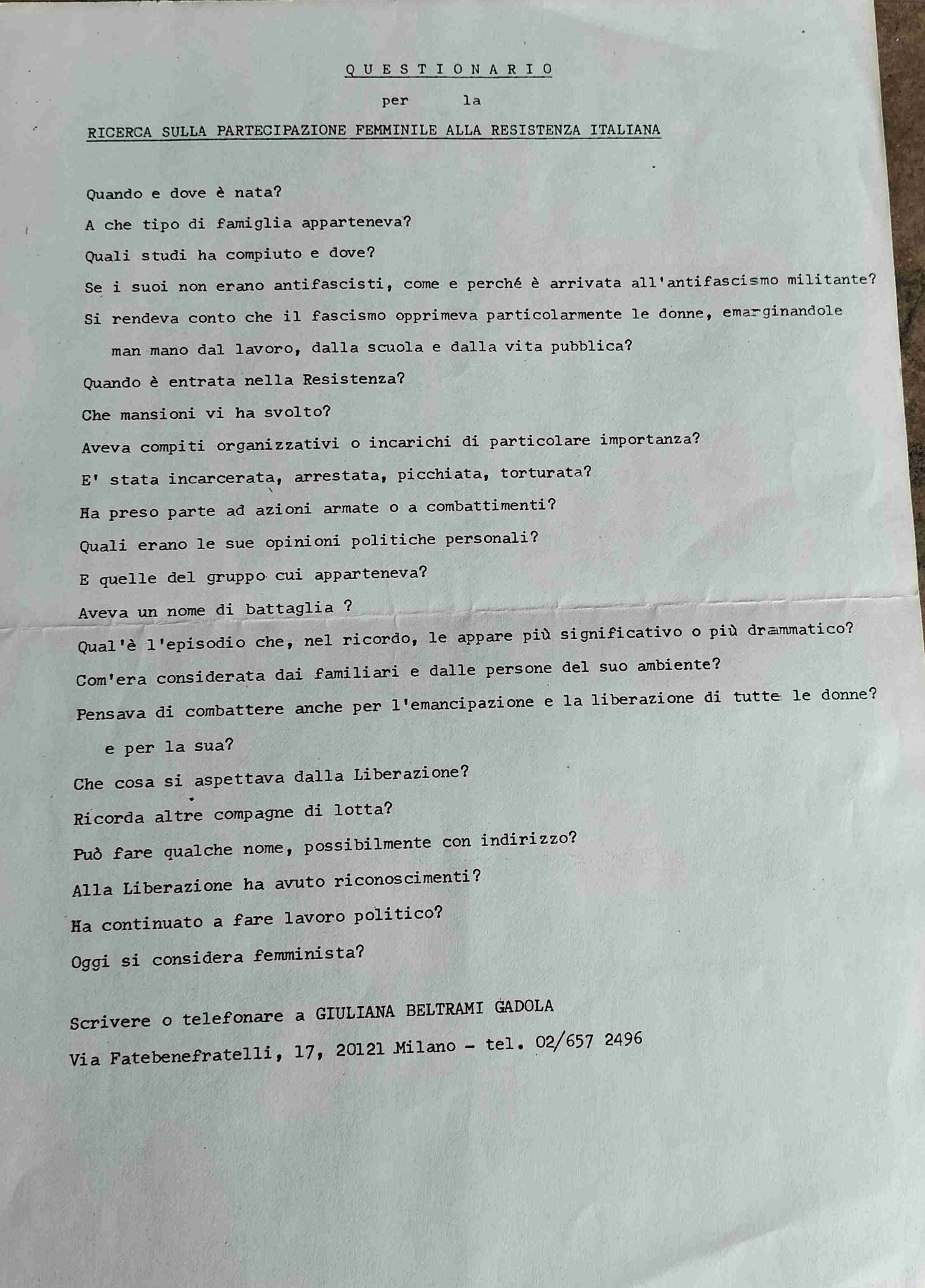 Da un lato, nonostante le indiscutibili conquiste dell’immediato dopoguerra, il diritto di voto, la Costituzione, l’accesso all’istruzione, agli occhi delle femministe degli anni Settanta le partigiane appaiono più “madri” che “sorelle”. Colpisce in negativo l’abbandono, a volte repentino a volte graduale, di quei terreni su cui era stato realizzato lo “sconfinamento” dai ruoli tradizionali. Un arretramento e una smobilitazione che trovano indiretta conferma anche nelle carte del fondo Gadola Beltrami: molte tra le donne che vengono contattate per la realizzazione di Volontarie della libertà aprono le loro lettere con frasi quali “non pensavo alla Resistenza da molto tempo” o “sono fatti che avevo quasi dimenticato” e così via.