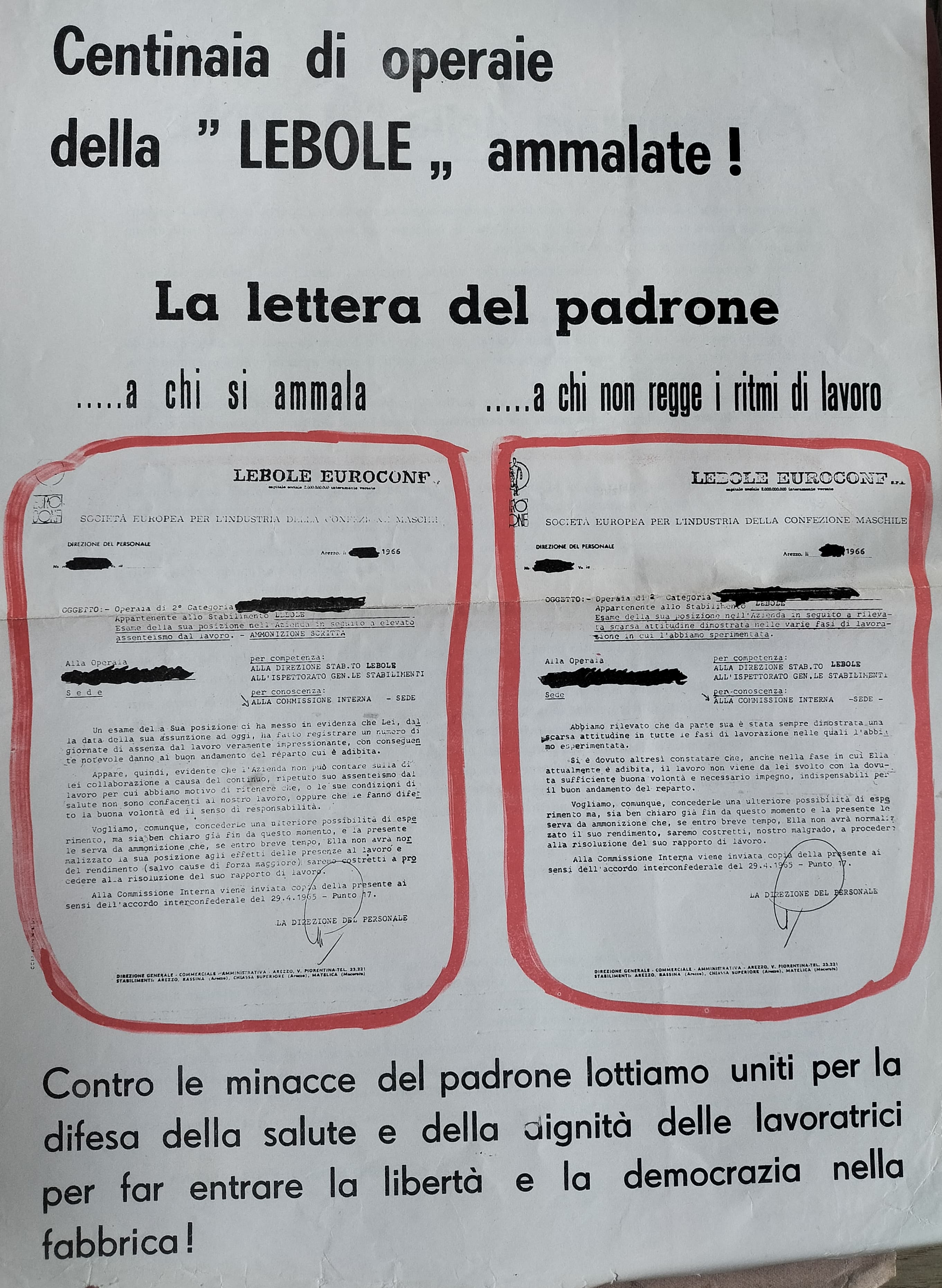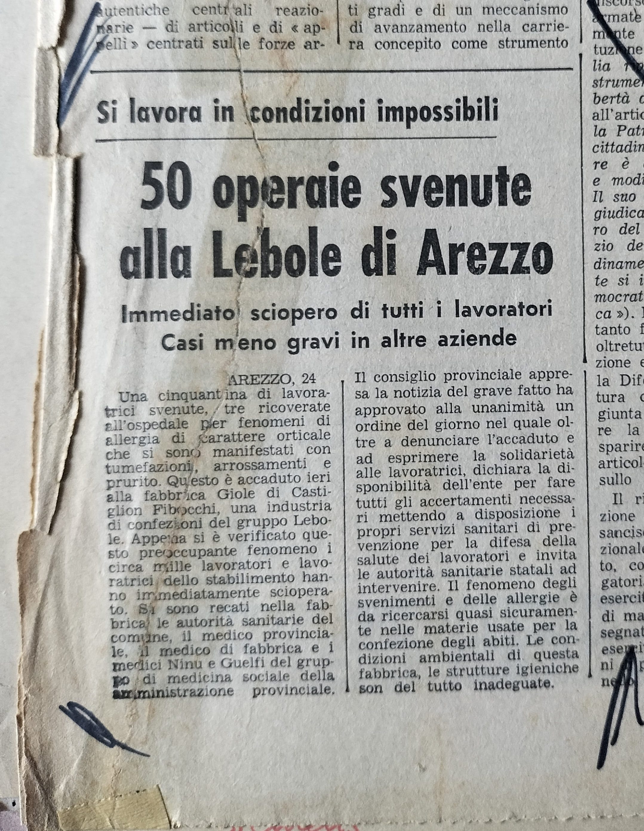 Ma la Lebole degli anni Sessanta si configura anche come una realtà di frontiera: è un’azienda di grandi dimensioni, 3000 addetti nel ‘63 che sfioreranno i 5000 nel ’72, in cui la presenza di un sindacato forte e organizzato può contare sulla spontanea combattività delle sue iscritte. In un volantino della CGIL Arezzo del 6 febbraio 1965 si legge: «noi vogliamo che una parte dei profitti, pagati dal maggior sfruttamento del lavoro, vada anche ai lavoratori. Sfondando alla Lebole potremo ottenere un buon contratto nazionale ed un salario adeguato al costo della vita»².