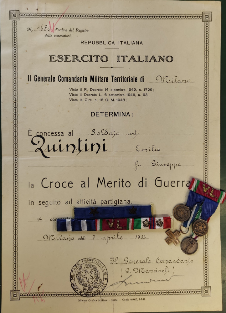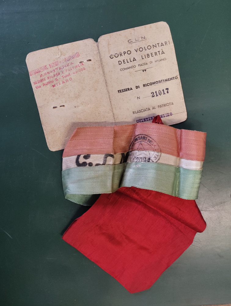 Completano il panorama dei manufatti che ci raccontano la Resistenza dal punto di vista materiale alcuni cimeli che furono indossati da partigiani combattenti lombardi. Ecco allora le decorazioni di guerra e il bracciale del CVL indossati nei giorni della Liberazione dal partigiano Emilio Quintini; ma anche il distintivo da giacca appartenuto al sestese Giorgio (Geo) Agliani, vice comandante delle brigate Garibaldi della Lombardia e, nel secondo dopoguerra, regista di film a basso costo e produttore cinematografico (tra gli altri: Il sole sorge ancora, 1946; Caccia tragica, 1947; Achtung! Banditi!, 1951; L’Agnese va a morire, 1979); e per finire il fazzoletto da collo, di un rosso ancora acceso, e il distintivo in metallo di Giustizia e Libertà appartenuti all’avvocato Arialdo Banfi, uno dei membri di maggior spicco del Partito d’Azione, nel dopoguerra esponente di rilievo del Partito socialista (fu senatore per tre legislature e sottosegretario agli Affari esteri nel primo governo Moro).