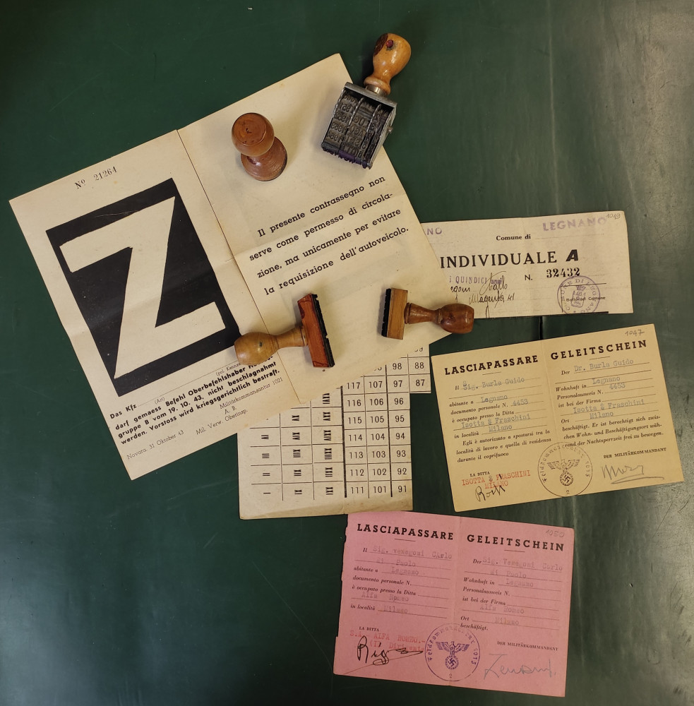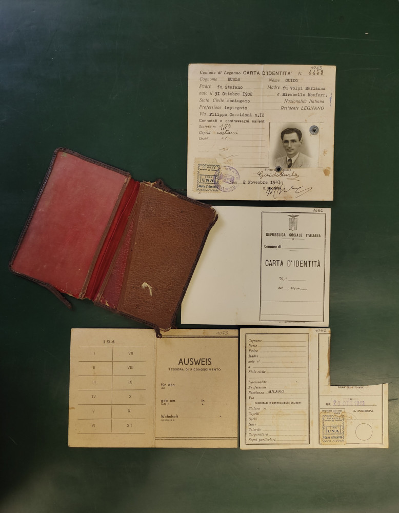 Sempre all’interno del fondo Carlo Venegoni possiamo trovare un altro oggetto estremamente evocativo. Si tratta di un astuccio portadocumenti in finta pelle, assai logorato dal tempo, appartenuto a Mauro Venegoni, che fu catturato e barbaramente ucciso dai fascisti nell’ottobre del 1944. Assieme all’astuccio troviamo diversi documenti falsi utilizzati dai Venegoni durante la lotta clandestina (e uno di questi è proprio una carta d’identità posticcia di Mauro). Magari non così intriganti, nello stesso fondo, ma certamente significativi, alcuni timbri utilizzati per la falsificazione dei documenti (carte d’identità, lasciapassare, carte annonarie, ecc.) necessari ai partigiani per camuffarsi tra la popolazione e potersi muovere liberamente attraverso le maglie degli occupanti nazisti e dei loro sodali fascisti.