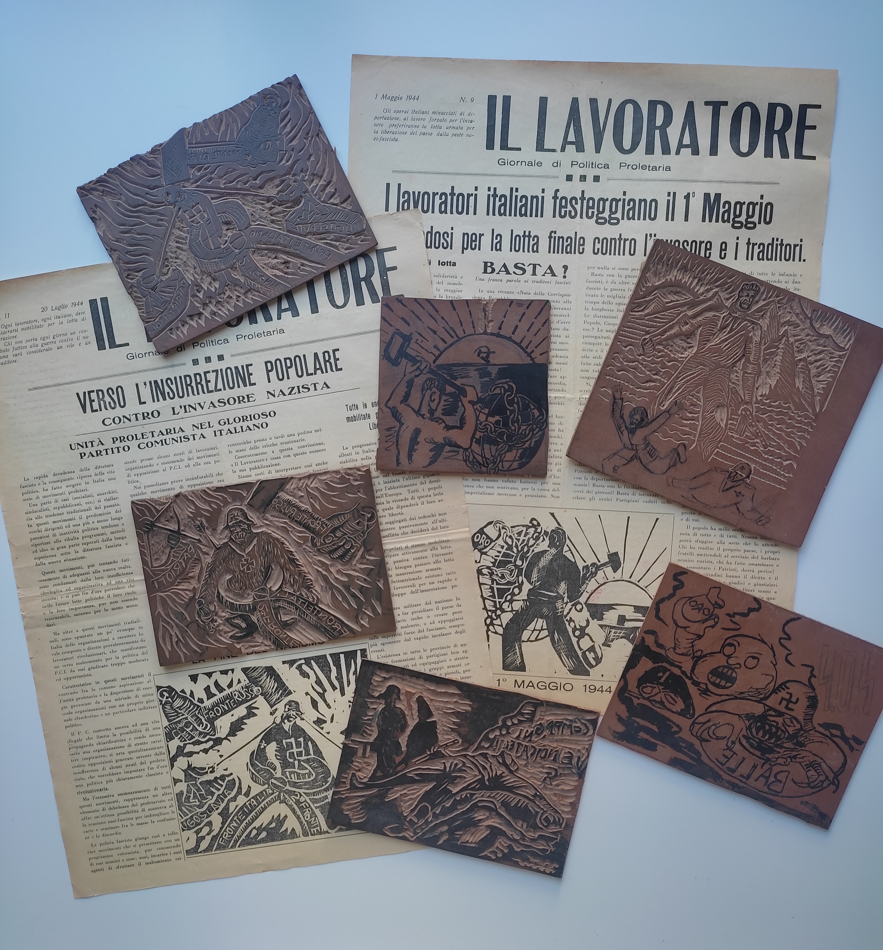 Tra gli oggetti più singolari connessi alla lotta di Liberazione custoditi in Fondazione ISEC possiamo certamente ricordare i cliché di linoleum incisi a mano conservati nel fondo Carlo Venegoni. Il fondo raccoglie le carte di questo straordinario protagonista della Resistenza lombarda, il legnanese Carlo Venegoni appunto, nonché documenti personali dei suoi tre fratelli (Mauro, Guido e Pierino), tutti combattenti della libertà. I fratelli Venegoni organizzarono la lotta armata nella zona di Legnano dando vita a un raggruppamento comunista non organico al Partito comunista (sino al giugno 1944, quando tutti i fratelli rientrarono nel Partito, a parte Mauro), ma furono attivissimi anche nella produzione di stampa clandestina e i cliché conservati nel fondo servirono a illustrare alcune di queste pubblicazioni. (tra le altre, il periodico Il Lavoratore)
