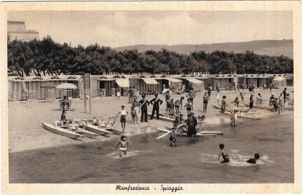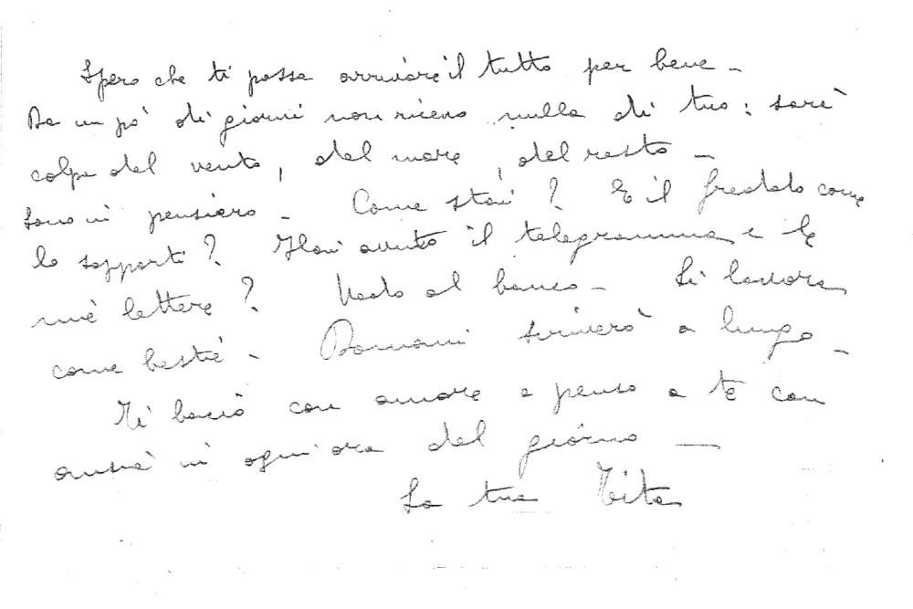 Mio caro amore, sono appena arrivato a Manfredonia […] e ti scrivo subito dall’albergo (diciamo così!) dove sono alloggiato. Chiamarlo albergo è arbitrario da parte mia e presuntuoso da parte della proprietaria […] Domani bighellonerò un po’ per la città (anche qui c’è dell’arbitrario e del presuntuoso).
