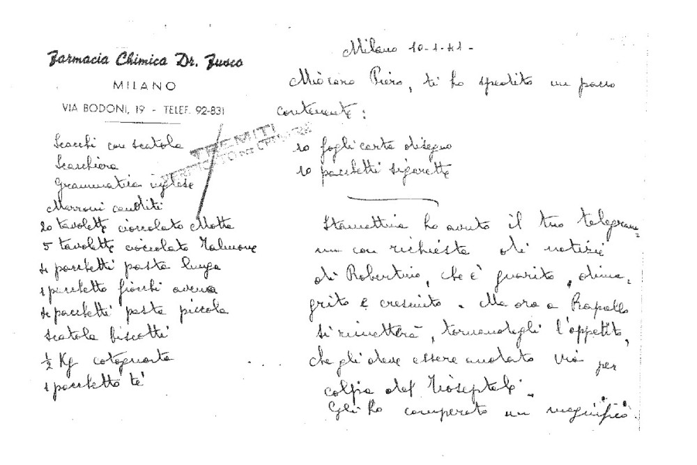 Il fondo Piero Montagnani Marelli e Tita Fusco è ricco e sfaccettato e tra l’altro contiene un corposo carteggio che insiste sui sentimenti e gli stati d’animo indotti dalla forzata separazione, sul resoconto di scene di vita familiare, sui problemi legati alla gestione economica della farmacia ma che, seppur tra le righe a causa della censura, lascia intendere le dure condizioni di vita di Piero e degli altri perseguitati politici, e anche l’incertezza, le preoccupazioni, le ansie di chi, come Tita, è rimasta a Milano a gestire lavoro e famiglia nel contesto di un regime dittatoriale sempre più pervasivo e bellicista. Da questo variegato insieme abbiamo preso in esame solo la sezione relativa al periodo ottobre 1940 - febbraio 1941, quando Piero era internato civile alle Tremiti.