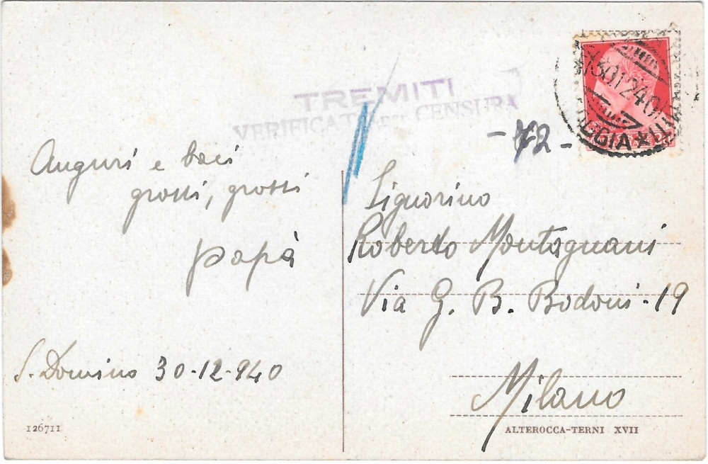 Le lettere di Tita arricchiscono l’analisi della condizione concentrazionaria con frasi rivelative della situazione che si vive in città nei primi mesi della guerra. Quella di Tita è una condizione familiare agiata: lei gestisce un laboratorio farmaceutico, ha dei dipendenti, abita in un confortevole appartamento con servizi e riscaldamento, si concede degli spettacoli alla Scala e delle vacanze a Rapallo in Liguria. Tutto ciò non riesce però a lenire le preoccupazioni per la sorte del marito lontano, accentuate dal dramma della morte del secondo figlio. A ciò si aggiungono i primi effetti visibili della guerra: la mancanza di caffè e di altri alimenti come patate, riso, pasta che rende sempre più complicato l’invio di pacchi alimentari verso le Tremiti; i ripetuti allarmi per i bombardamenti degli Alleati che costringono a rifugiarsi in cantina; l’ansia di parenti e vicini di casa per i figli e mariti al fronte. Scrive Tita in una lettera del 13 novembre 1940: