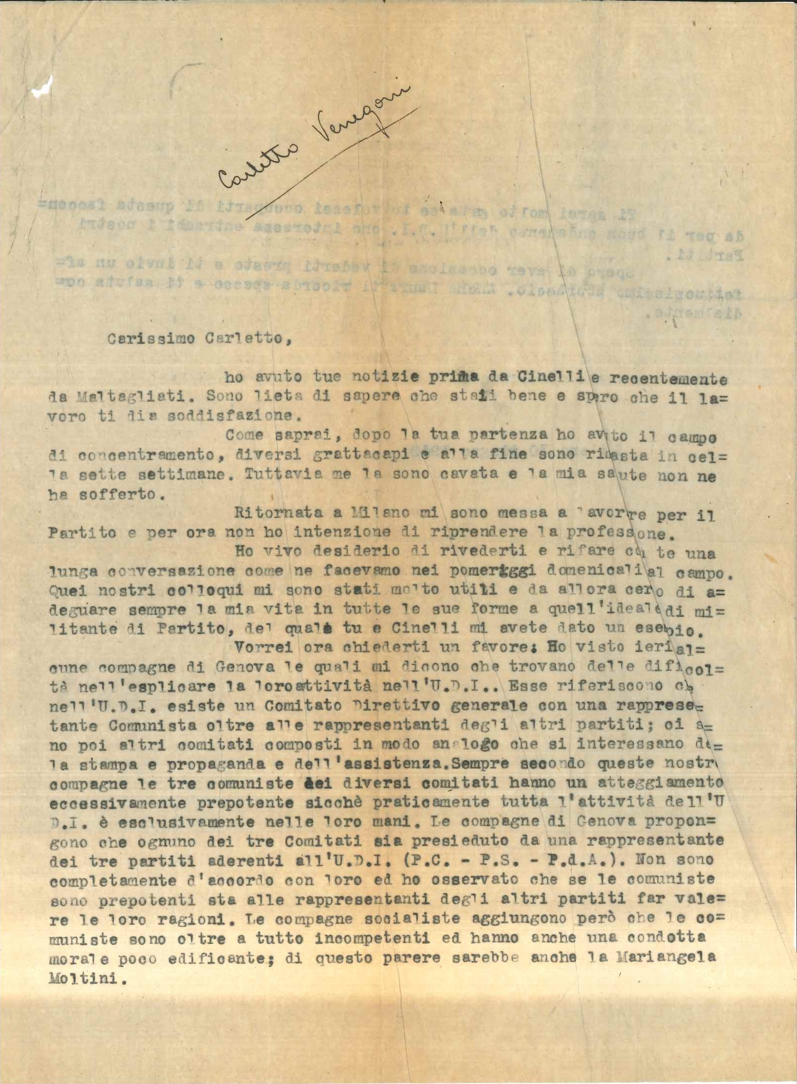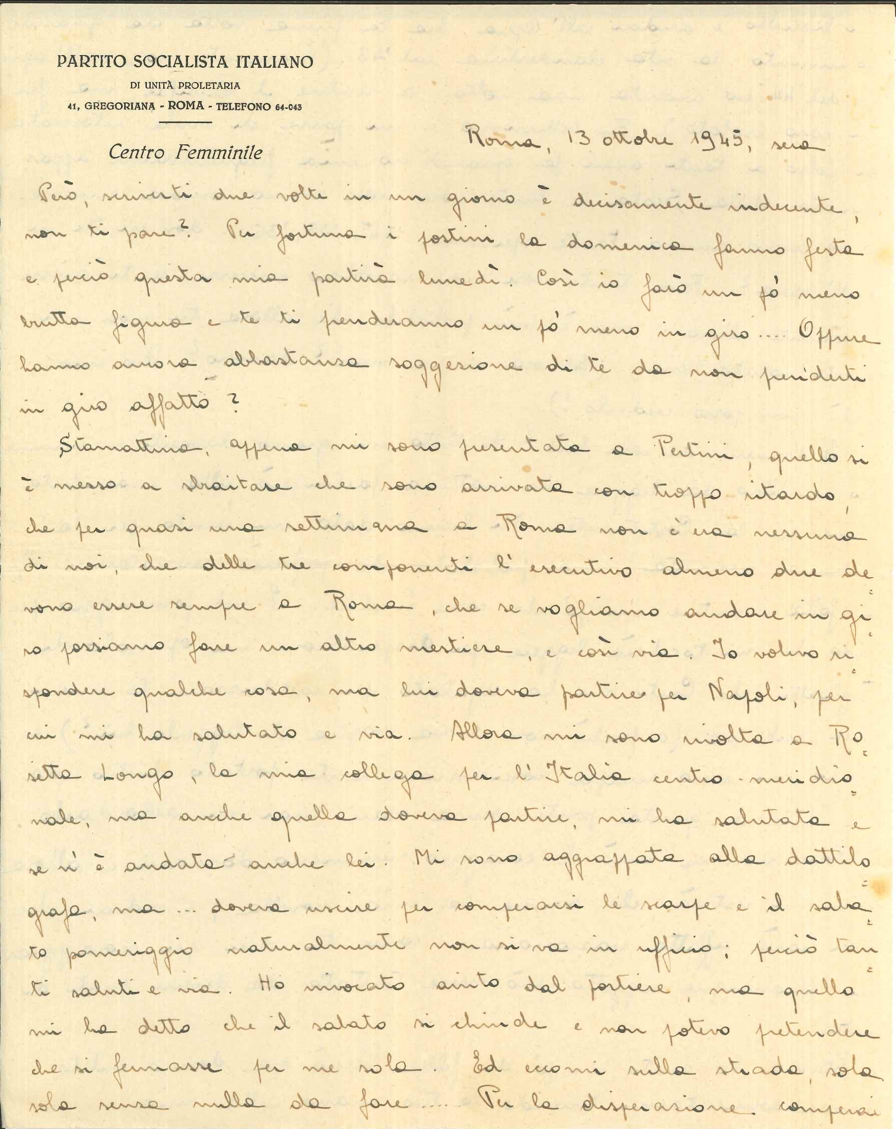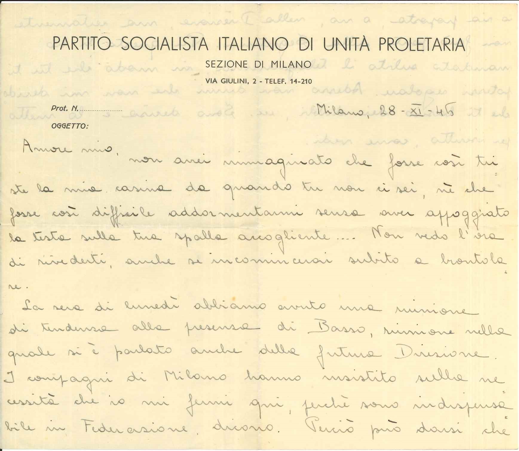 Incertezze passeggere, ben presto fugate, da quel che si arguisce dalle lettere successive, in cui il tono si fa più disteso, più pacato, tornando all’antica consuetudine di una esposizione capillare di sentimenti e stati d’animo, ma anche di pensieri e di resoconti di impegni politici e sociali, con la consueta verve ironica, che doveva essere una caratteristica peculiare di questa donna. Si legga ad esempio l’incipit di questa sua del 20 settembre 1946, scritta su carta intestata della Sezione di Milano del Partito socialista italiano di unità proletaria: